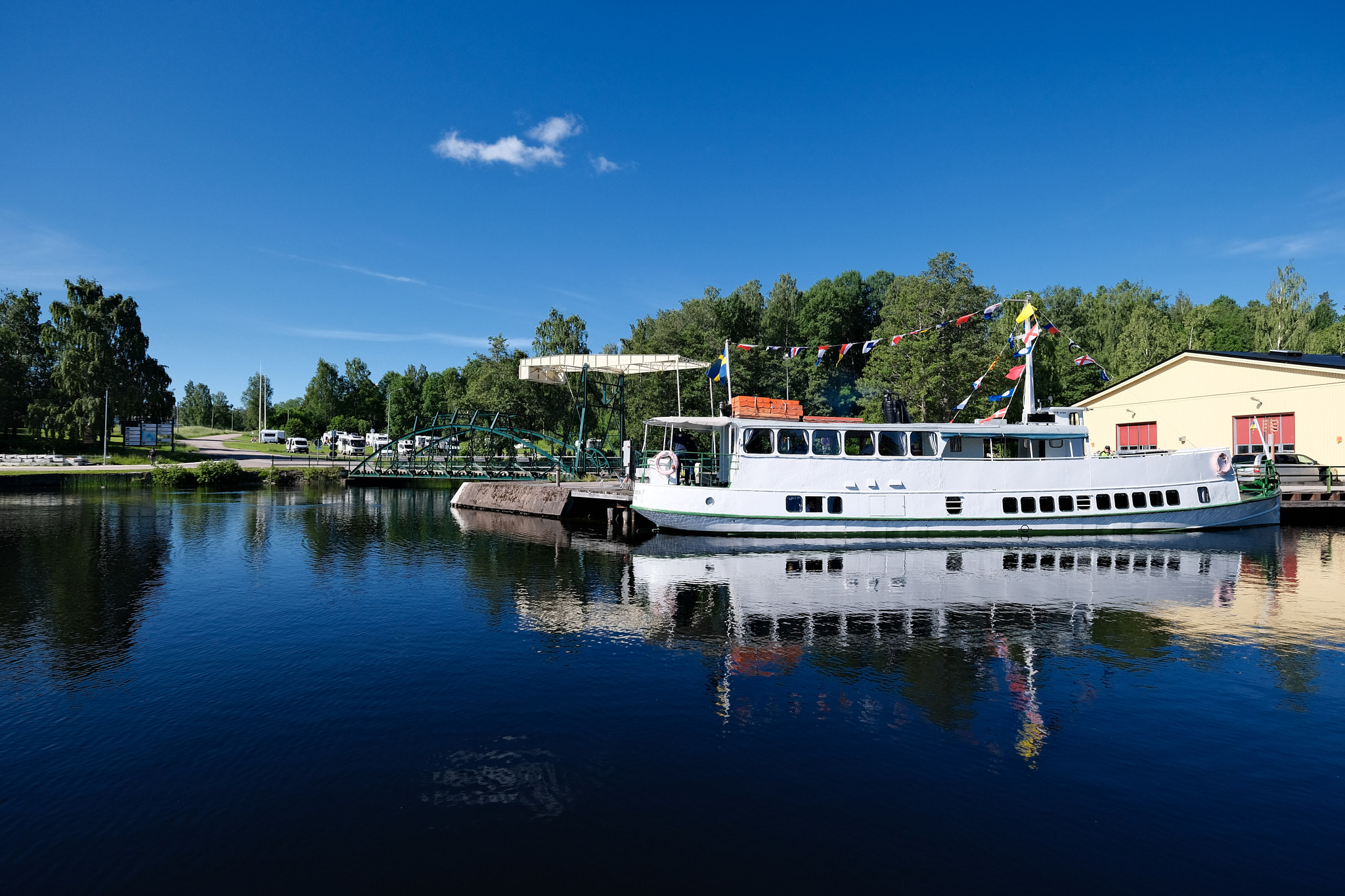 Heute kriegt eine Gruppe von zukünftigen Schleusenwärtern und -wärterinnen eine Einführung an einer der Schleusen. Und unten an der Anlegestelle am See wird schon der Motor eines alten Ausflugsbootes aufgewärmt. Um 10 Uhr wird es die tägliche Ausflugsfahrt nach Bengtsfors (und zurück) geben. Das wäre vielleicht eine Ausflugsmöglichkeit für morgen.