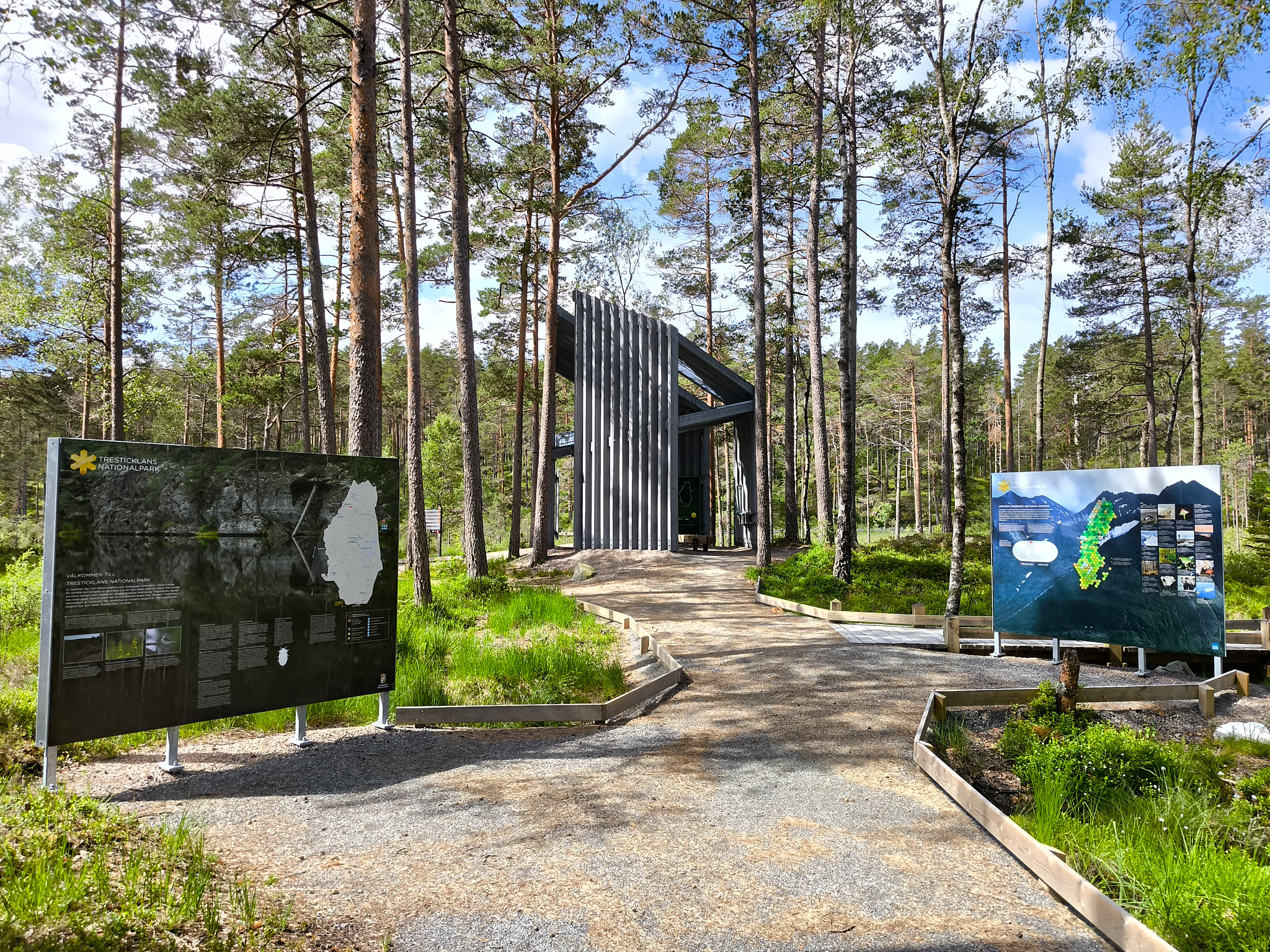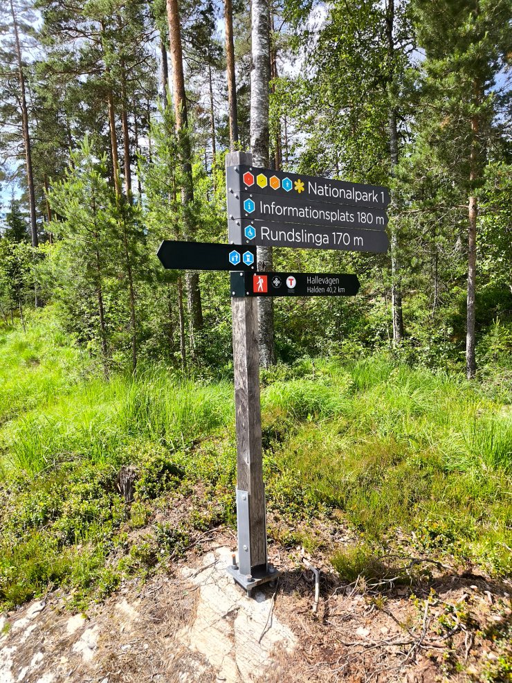 Im Tresticklan Nationalpark gibt es nur drei Wanderwege! Man kann zum Beispiel bis an die norwegische Grenze zur Hütte Budalsvika (4.5km, 2h) wandern, oder den Nationalpark in Nord-Süd-Richtung auf dem Orshöjdsleden (6.4km, 2.5h) queren. Ich wollte aber wieder eine Rundwanderung machen. Guten Mutes habe ich daher einen kleinen Lunch eingepackt und mich auf zur Bråtaneslingan (4.3km, 1.5h) aufgemacht. Diese muss man mit dem Bodalsvikenleden kombinieren und kommt total auf 9km. Startend vom Wohnwagenparkplatz erreiche ich nach ein paar hundert Metern das futuristische Gebäude des Haupteingangs des Nationalparks.