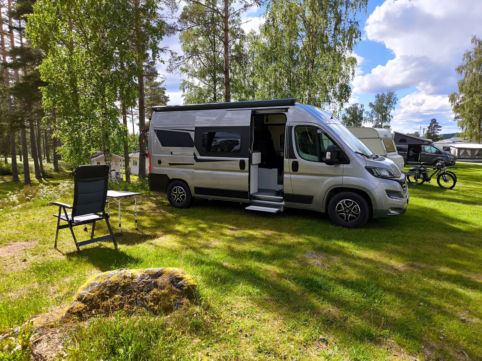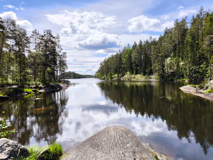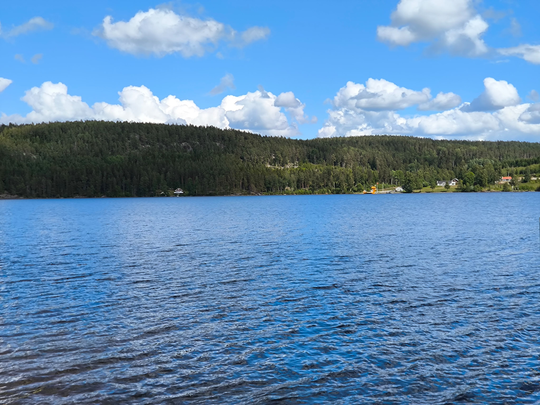 Am Ende der Stichstrasse bog ich links ab Richtung Nössemark. Nach gemütlichen 20km musste ich nur 20 Minuten auf die Fähre warten. Diese fährt regulär zu wenigen Zeiten, kann aber alle 30 Minuten mit einem Telefon angefordert werden. Meine Fährfahrt war eine reguläre, ich musste also nicht das Telefon benutzen. Kurz vor Abfahrt erschienen hinter mir auch noch eine Reihe von Autos. Auf der anderen Seite des Sees durfte ich auf einer perfekt ausgebauten Strasse die 35km nach Ed und meinem Ziel, dem Gröne Backe Camping, kurven. Dort hatte ich einen schönen, erhöhten Platz für zwei Nächte erhalten. Dieser Umweg hatte sich sehr gelohnt!
