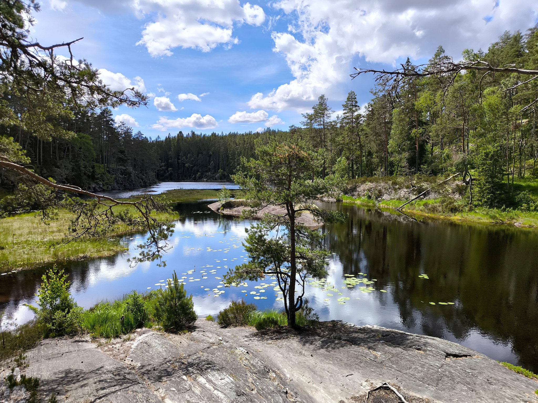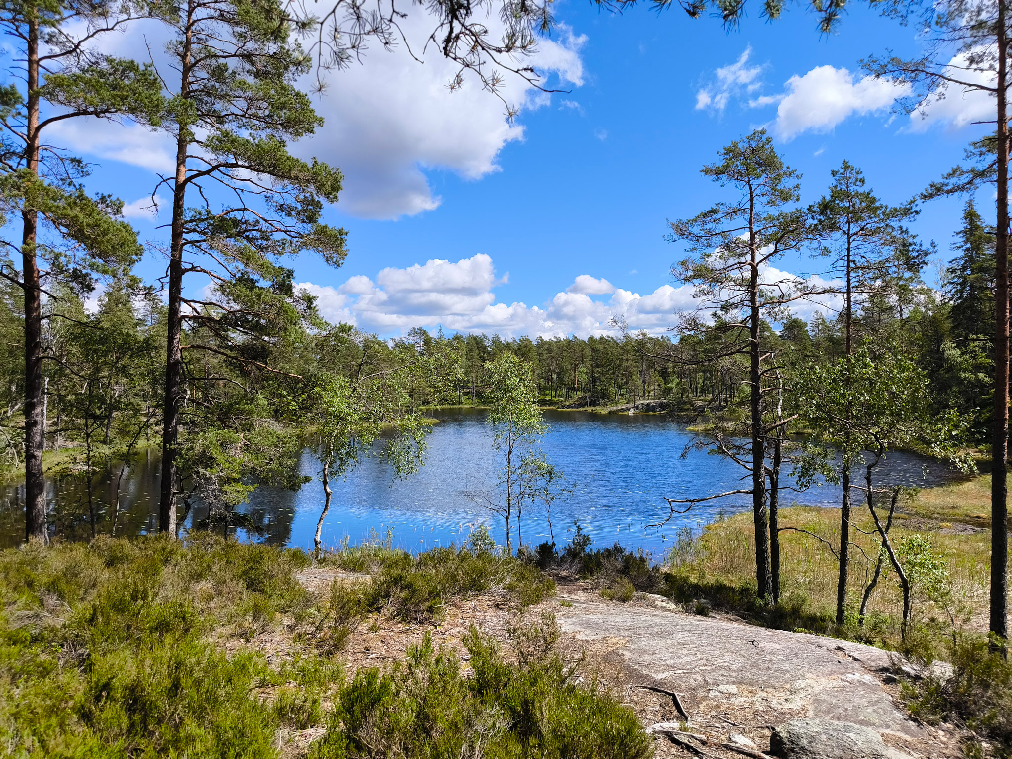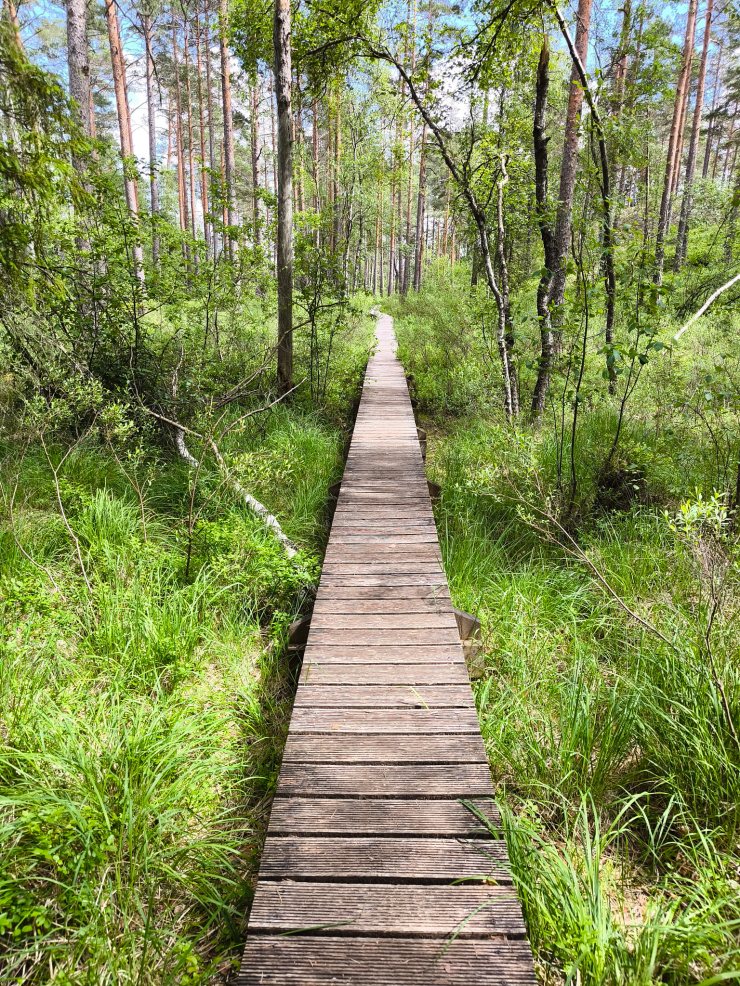 Wenn der Weg also in Nord-Süd- oder Süd-Nord-Richtung geht, dann entlang eines der Hügelkämme, was ein recht einfaches Fortkommen bedeuten. Bewegt er sich jedoch in Ost-West- oder West-Ost-Richtung dann geht es rauf auf die Hügelkämme und wieder runter, dann über Bohlenstege durch die Sümpfe zwischen in den Tälern des Waschbretts. Dafür ergeben sich immer wieder tolle Ausblicke auf die schmalen, langen Seen. Ich habe machmal gedacht, dass ich diesen See doch schon mal gesehen hatte. Aber das war tatsächlich erst auf dem letzten Streckenabschnitt der Fall, wo der Hin- und Rückweg der selbe waren.