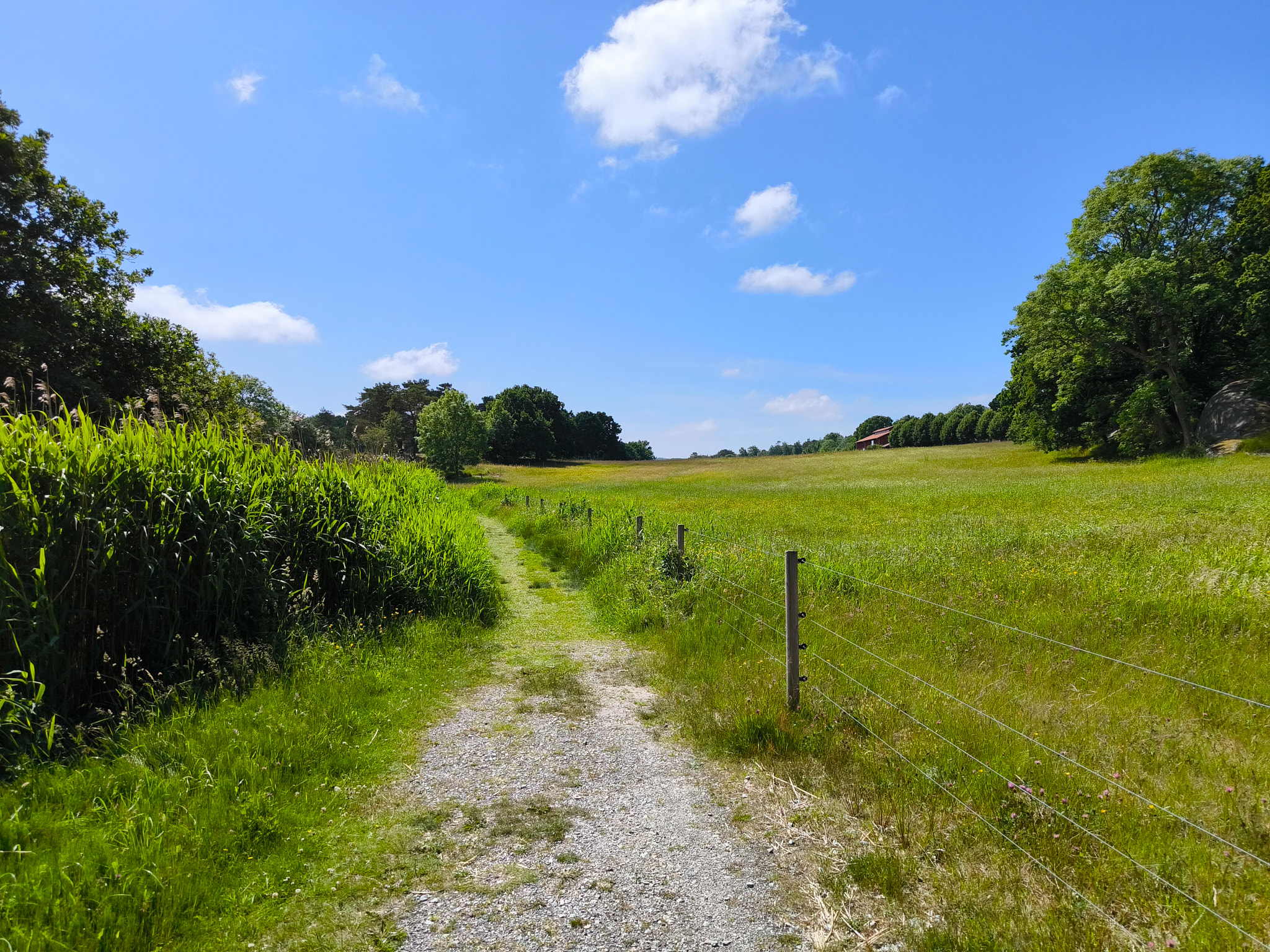 Hinter dem Parkplatz geht es zuerst über den blanken, vom Gletscher geschliffenen Granit mit gigantischen Ausblicken über die Schärenlandschaft. Nach diesen überwältigenden Ausblicken kommt man beim grossen Parkplatz an und muss dann der Strasse bis zum Sotekanal folgen. Ich hatte Glück und die Drehbrücke ging gerade für ein wunderbares Segelschiff auf. Danach geht es nochmals ein gutes Stück der Strasse entlang, bis es querfeldein entlang von Feldern und durch schönen Mischwald weiter geht. Erst hier trennt sich die gelbe Runde von der orangen oder blauen Runde. Beinahe wäre ich nach dieser Kreuzung auf eine schön gemusterte Schlange getreten, welche sich auf der Strasse aufwärmen wollte. Dieses Unglück konnten wir beiden abwenden und die Schlange hat sich durch das Gras aus dem Staub gemacht (siehe Bild, so viel Zeit blieb noch). Nach rund einem weiteren Kilometer bin ich dann wieder zurück beim Parkplatz. Leider ist der einzige Picknicktisch durch eine ganze Wandergruppe besetzt, so geniesse ich die am Vortag gekauften, geräucherten Lachswürfel halt im Camper! Das hat wunderbar geschmeckt; ich habe selten so fein geräucherten Fisch gegessen.
