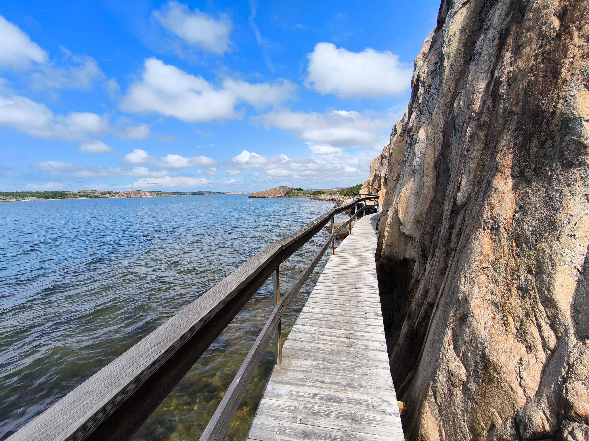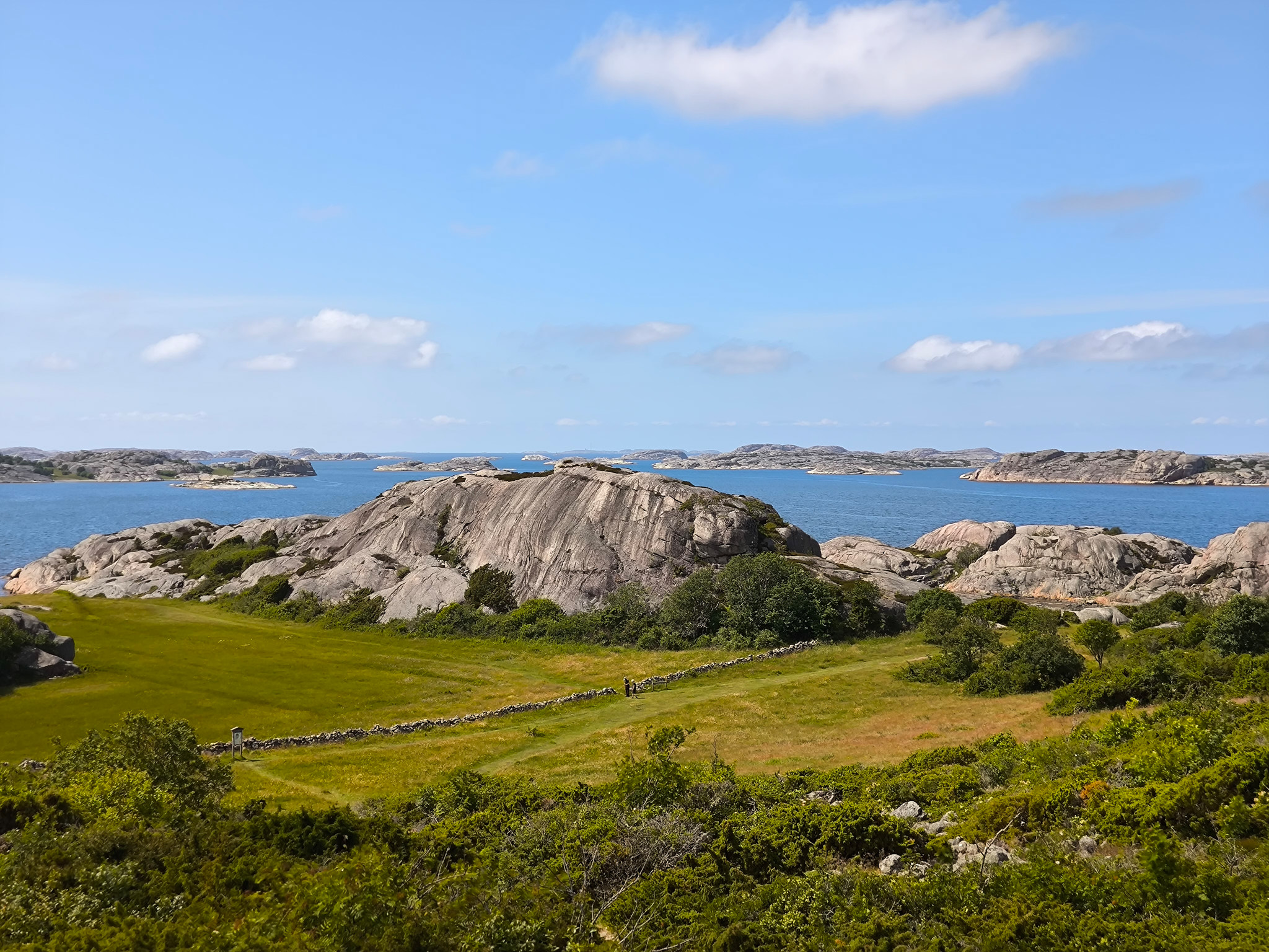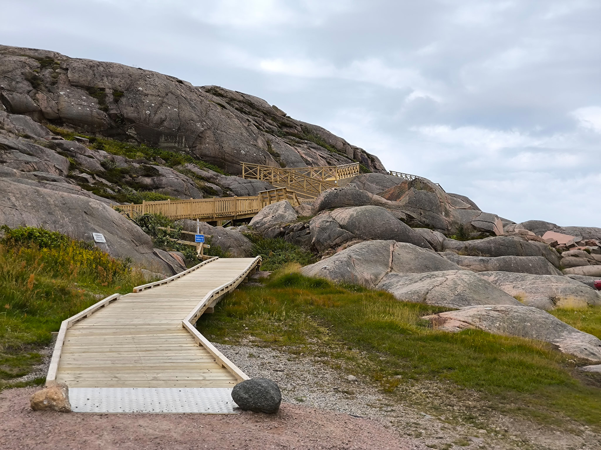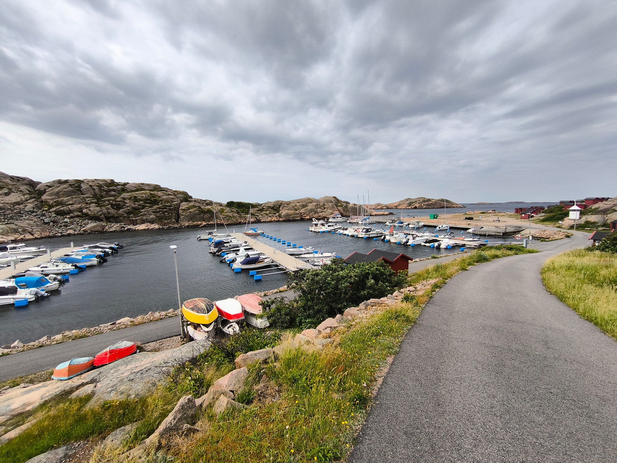 Die nur 3.2km lange Runde begehe ich dieses Mal im Gegenuhrzeigersinn vom Parkplatz aus. Daher geht der Weg zuerst entlang von schönen Wiesen, durch etwas Wald und erlaubt danach einen fantastischen Rundblick über die nördlichen Schären Bohusläns. Danach geht es entlang des Ufers und am Schluss über einen tollen Holzsteg über das Wasser, welche an den steilen Felsen angebaut wurde. Nach einem weiteren schönen Strand mit Blick über die Schärenlandschaft geht der Weg entlang der Marina mit Bilderbuchausblick auf Långsjö hamn.