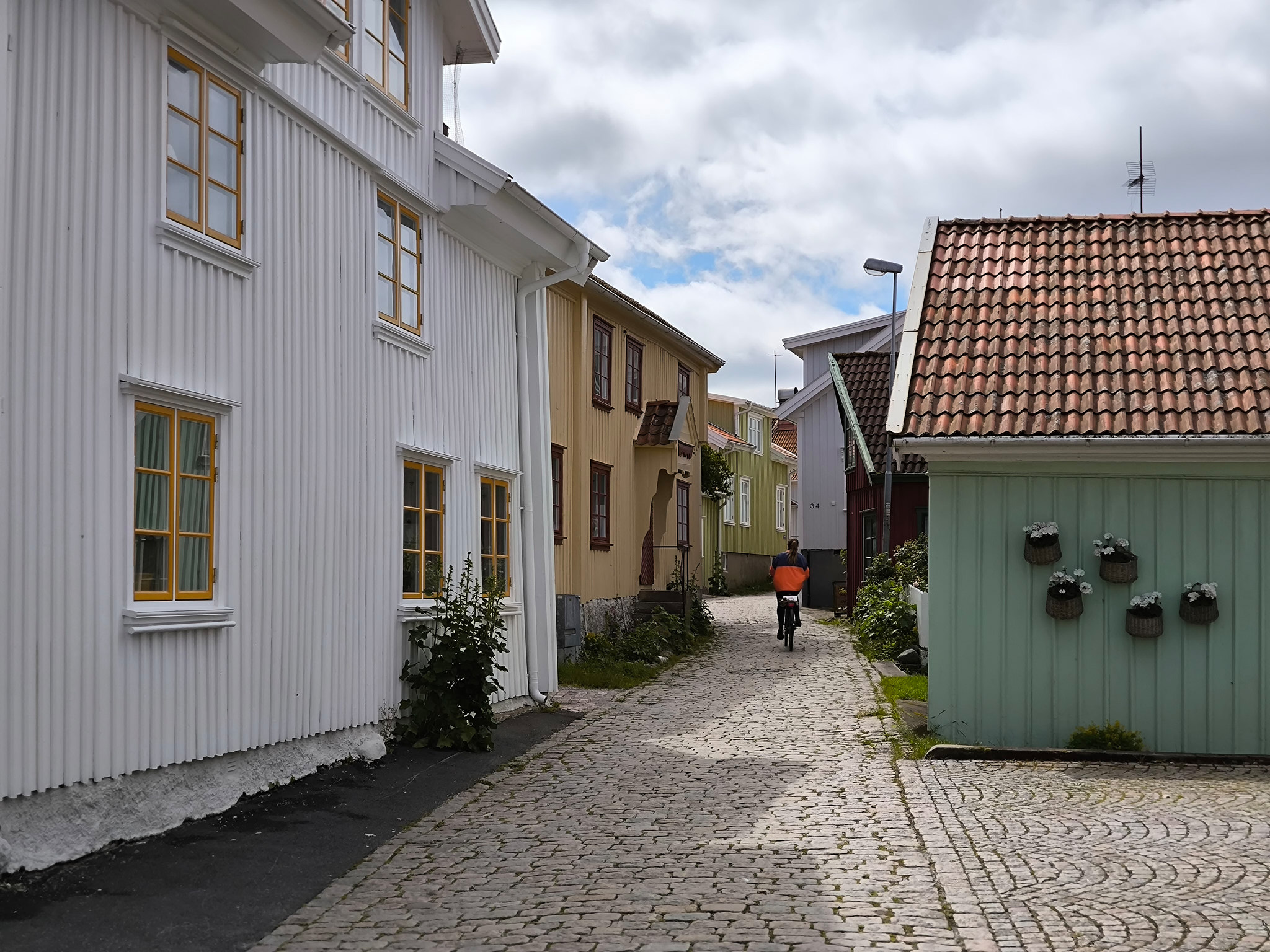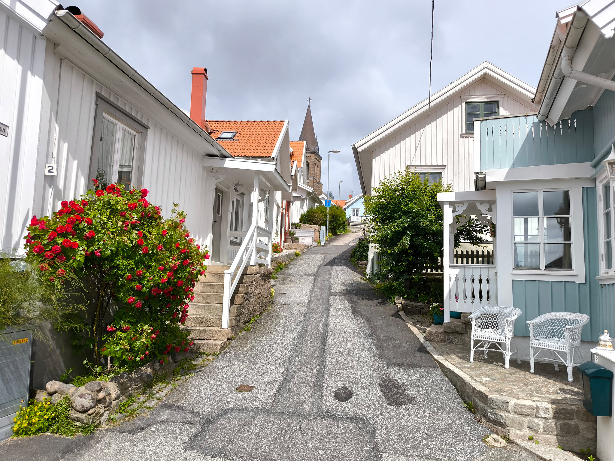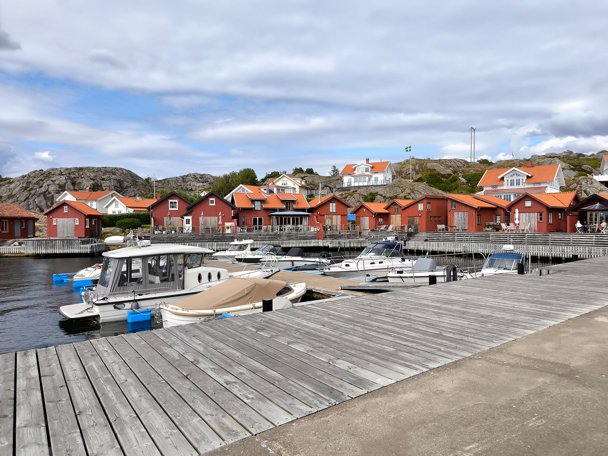 Da es immer noch trocken war und die Sonne auch mal zwischen den Wolken durchlugte, machte ich mich am späteren Nachmittag noch auf den recht kurzen Weg (etwa 20 Minuten) vom Campingplatz nach Fjällbacka. Dort konnte ich die vielen alten Häuser und den Hafen bestaunen. Am Hafen habe ich mir beim Fischdelikatessenhändler eine Portion geräucherte Lachsstücke für den nächsten Tag gekauft. Die Auswahl im Laden war sehr verlockend!
