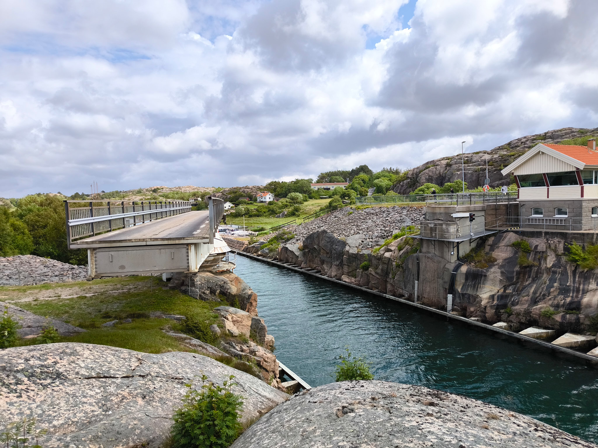 Einen kleinen Abstecher nach Klädesholmen habe ich mangels Wohnmobil-Parkplätzen abgebrochen – eine Fotografie der Brücke muss reichen. Auf der grossen Wiese neben dem Parkplatz des Tjörn Golfclubs, wo sich mein gebuchter Stellplatz befand, war ich dann ganz alleine. Ich konnte wunderbar das Treiben auf dem Parkplatz beobachten. Eine grosse Gruppe Männer hatte sich nämlich zum Mountainbiken verabredet. Das schöne Wetter hielt noch bis zum Abend, sodass ich das Abendessen draussen geniessen konnte. Nachts regnete es dann wieder einmal.