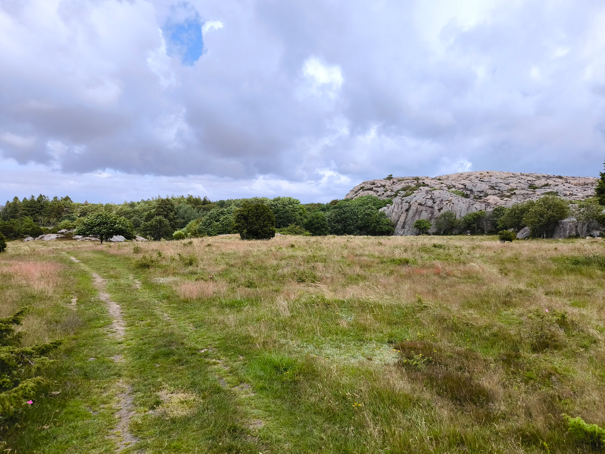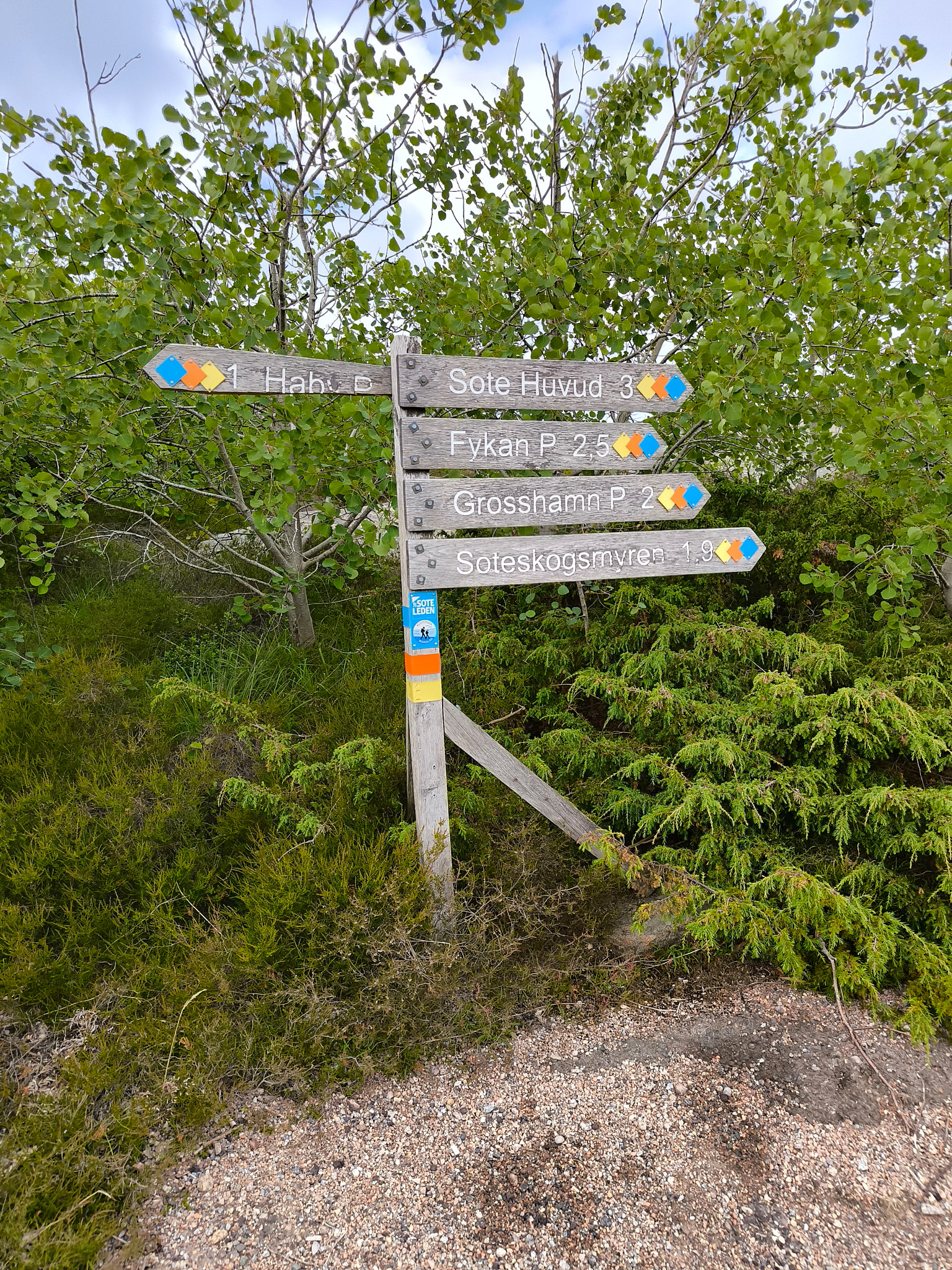 Es gibt drei Rundwanderwege zur Auswahl, welche im Kern aus demselben Weg bestehen (die gelbe Runde, 8.0km) und jeweils eine kürzere Verlängerung gegen Norden (die orange Runde, 12.3km) oder eine etwas längere Verlängerung (die blaue Runde – Soteleden/Kuststigen, 14.4km) gegen Norden. Ich habe mich wegen des unbeständigen Wetters für die gelbe Runde im Gegenuhrzeigersinn entschieden.