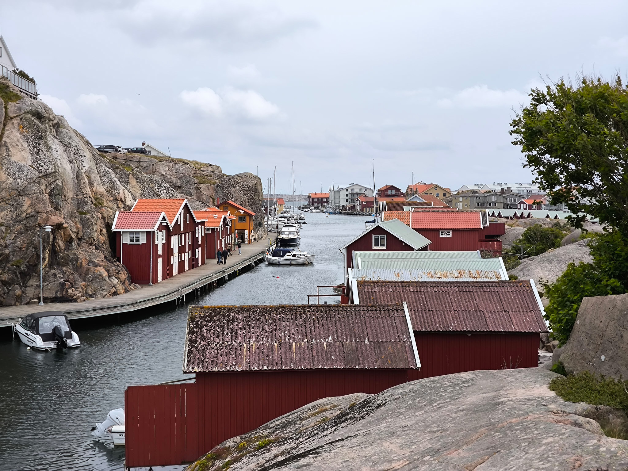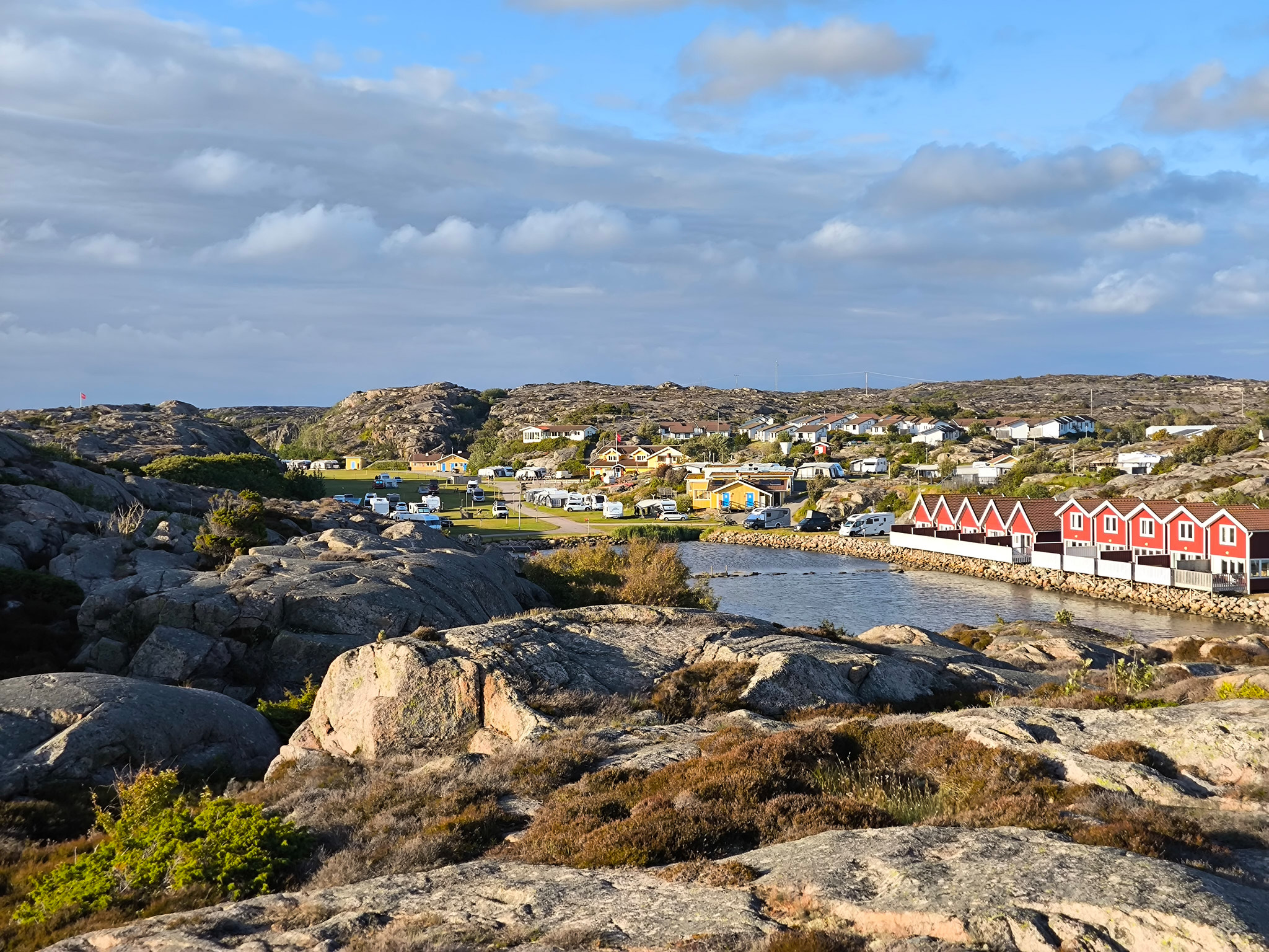 Zum guten Glück ist das Wetter an diesem Nachmittag hervorragend. Es ist seit langer Zeit wieder einmal richtig warm und sonnig, sodass ich vor dem Camper die Sonne geniessen kann. Ich mache mich trotzdem noch auf den Weg und erkunde den kleinen Ort hinter dem Camping. Dieser stellt sich, wie überall hier an der Küste, als ein alter kleiner Fischerort heraus, welcher komplett in eine Ferienanlage umgebaut wurde. Jeder ehemalige Fischerschuppen ist eine Ferienwohnung. An den Hängen wurden die Häuser zu regelrechten Ferienvillen renoviert. Alles ist perfekt in Schuss. An der Strasse steht eine fast unendliche Reihe der für Schweden typischen Briefkästen. So stellen sich die Städter aus Göteborg und die wohlhabenden Norweger Urlaubsidylle vor. Die kleinen ehemaligen Fischerorte sind im Kern also fast ausschliesslich Feriensiedlungen mit wenigen realen Einwohnern. Das war wenigstens mein Eindruck. Für die Handwerker und Gärtner ist das wohl ein sehr gutes und einträgliches Geschäft, die nur sehr wenige Wochen im Jahr benutzten Ferienhäuser in Schuss zu halten… Sie wohnen etwas ausserhalb, wo es mehr Platz für ein schönes Haus gibt. Es braucht hier also schon ein Naturschutzgebiet, um auf nicht privatem Gelände etwas unternehmen zu können.