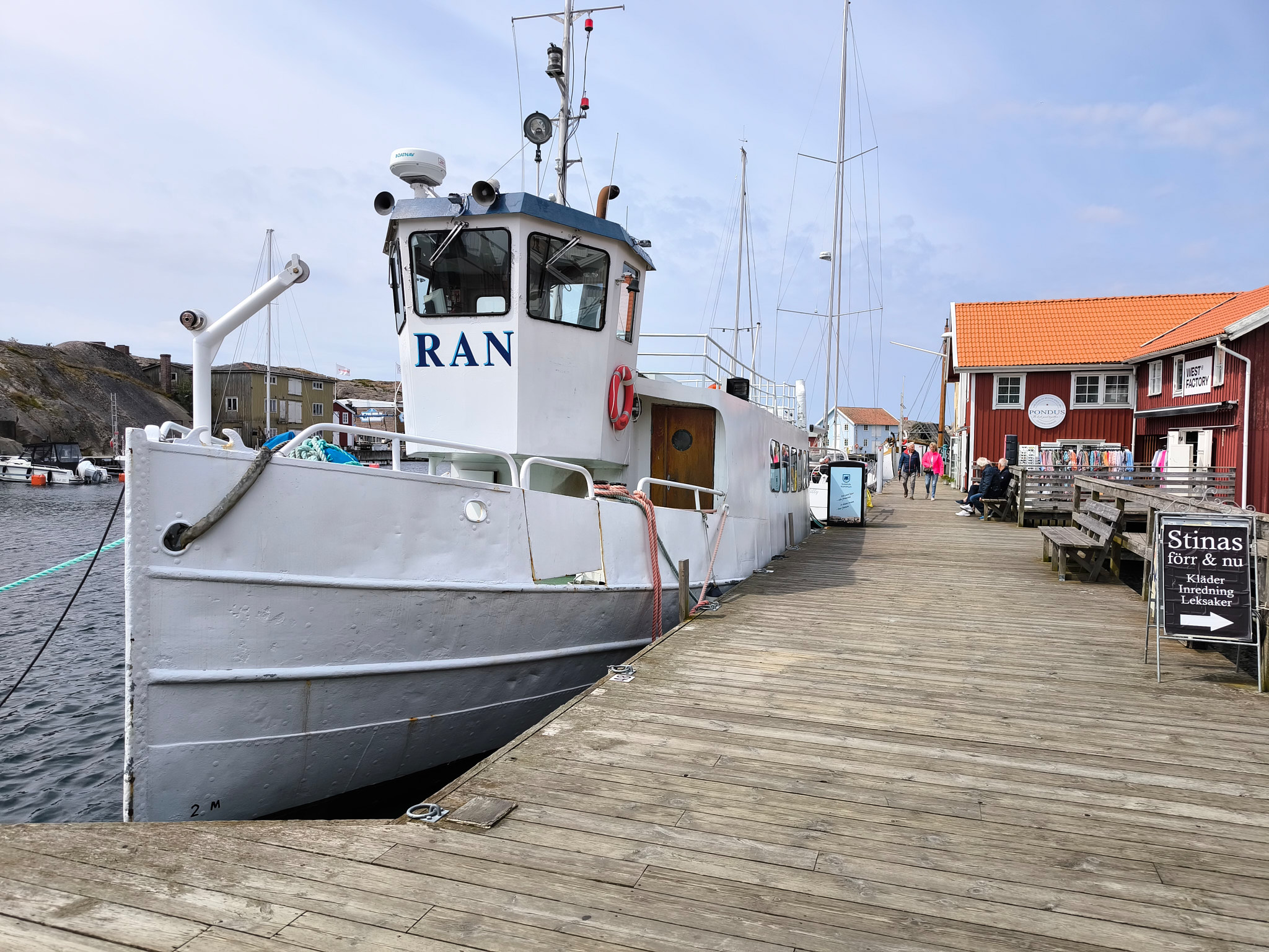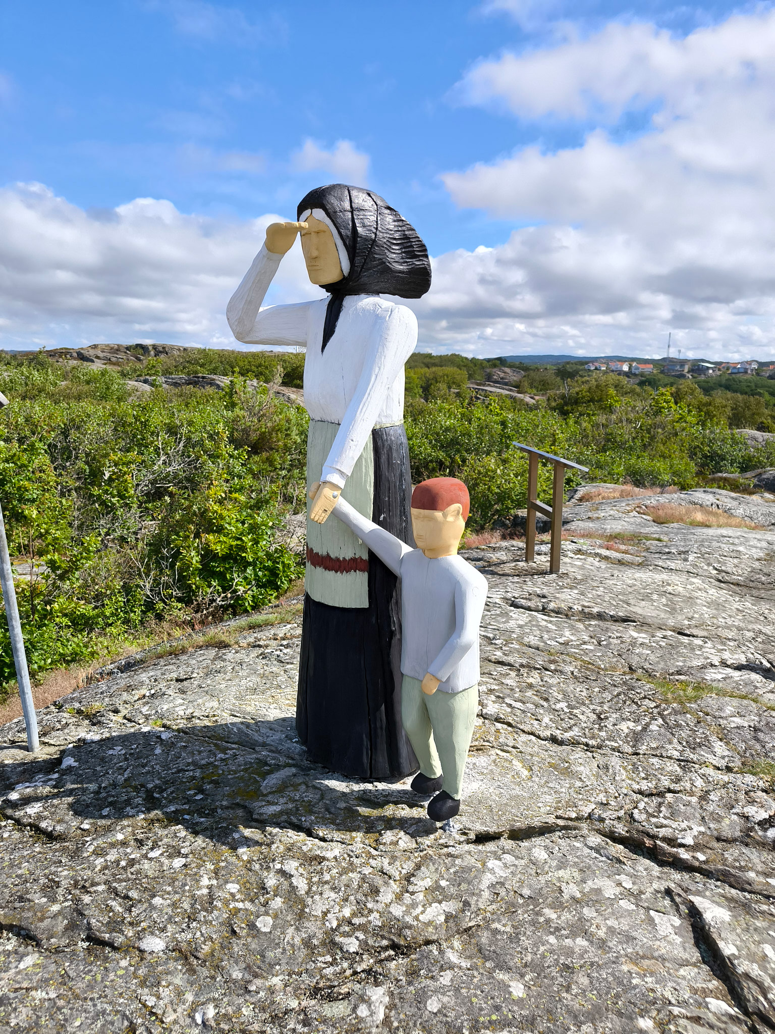 Auf meiner Fahrt über Orust und Tjörn habe ich zuerst den kleinen Fischerort Mollösund besucht. Als allererstes ging ich auf den Aussichtspunkt Klockeberget, wo die Fischerfrau mit ihrem Kind nach ihrem Mann Ausschau hält. Sie war sicher jedesmal wieder froh, wenn er gesund wieder zurück kam. Beim Schlendern durch die „Hauptstrasse“ (Gatan) des Ortes, musste ich feststellen, dass das lauschige Mollösund für mich einer der schönsten Orte in den Schären von Bohuslän ist. Obwohl auch hier im überschaubaren Zentrum viele Ferienwohnungen sind, hat der Ort eine gewisse Ursprünglichkeit bewahrt. Und es gibt sogar mindestens zwei noch aktive Fischer mit Fischläden. Die gingen allerdings erst am Mittag auf, sonst hätte ich gerne etwas eingekauft. Im kleinen Hafen lagen wieder viele tolle Schiffe, die einem von Segelabenteuern träumen liess. Bei den vielen aufgestellten Schildern an der Strassenecke zum Gästehafen könnte man annehmen, hier sei extrem viel los. Das täuscht aber… Ich ging noch auf die andere Seite des Hügels den Katteviks Badplats besuchen, wo ich wieder einmal erstaunt war, dass dieser nur einen Monat lang, von Anfang Juli bis Anfang August, offiziell in Betrieb ist .