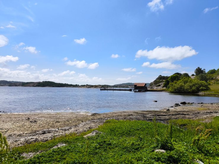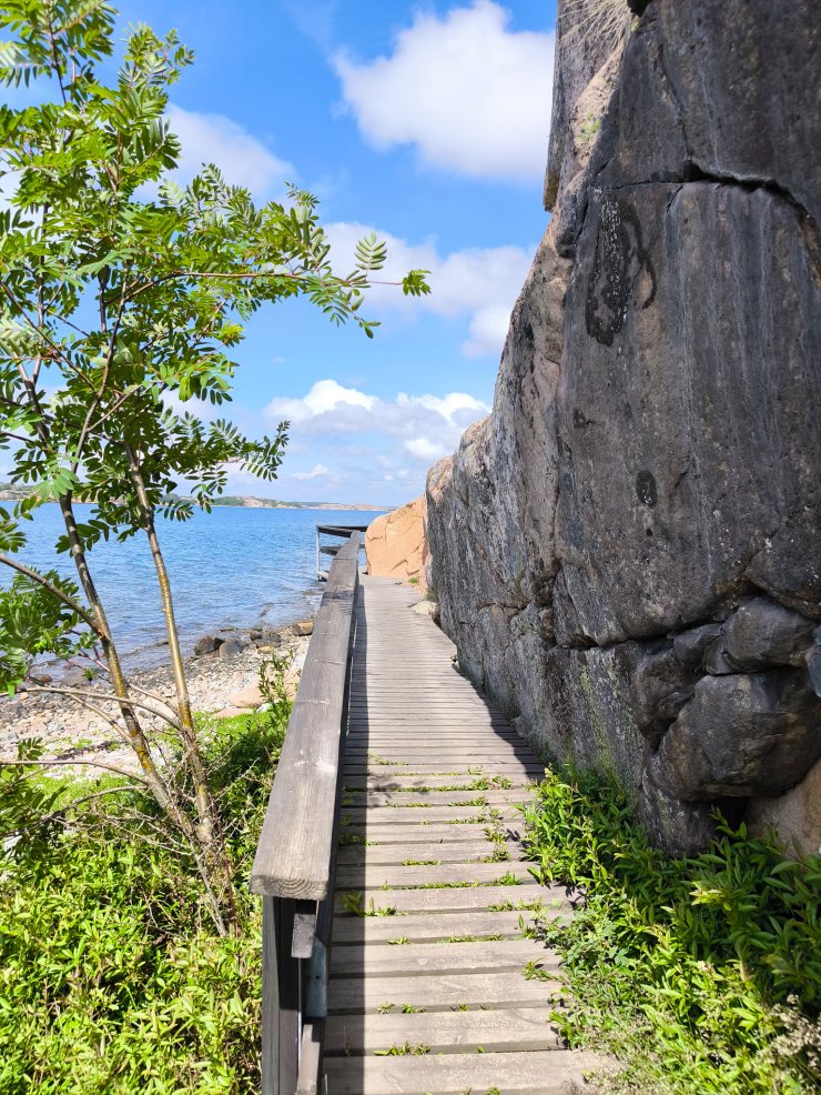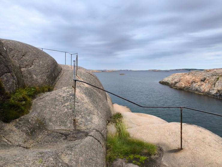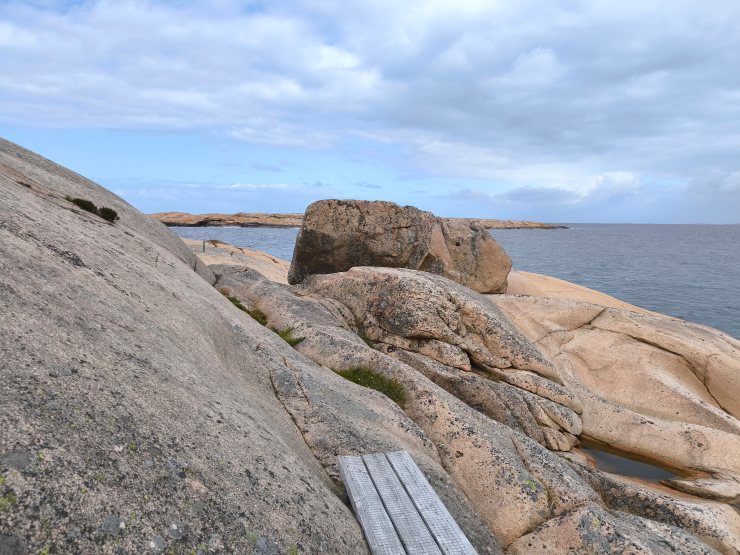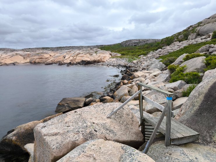 Die nur 3.2km lange Runde begehe ich dieses Mal im Gegenuhrzeigersinn vom Parkplatz aus. Daher geht der Weg zuerst entlang von schönen Wiesen, durch etwas Wald und erlaubt danach einen fantastischen Rundblick über die nördlichen Schären Bohusläns. Danach geht es entlang des Ufers und am Schluss über einen tollen Holzsteg über das Wasser, welche an den steilen Felsen angebaut wurde. Nach einem weiteren schönen Strand mit Blick über die Schärenlandschaft geht der Weg entlang der Marina mit Bilderbuchausblick auf Långsjö hamn.