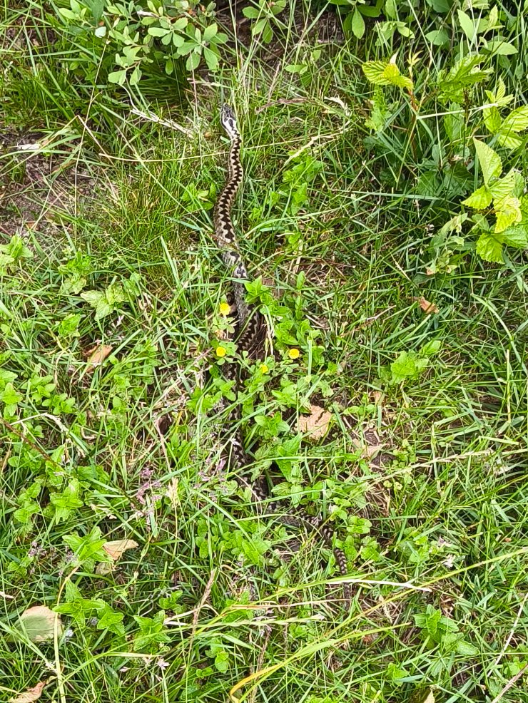 Hinter dem Parkplatz geht es zuerst über den blanken, vom Gletscher geschliffenen Granit mit gigantischen Ausblicken über die Schärenlandschaft. Nach diesen überwältigenden Ausblicken kommt man beim grossen Parkplatz an und muss dann der Strasse bis zum Sotekanal folgen. Ich hatte Glück und die Drehbrücke ging gerade für ein wunderbares Segelschiff auf. Danach geht es nochmals ein gutes Stück der Strasse entlang, bis es querfeldein entlang von Feldern und durch schönen Mischwald weiter geht. Erst hier trennt sich die gelbe Runde von der orangen oder blauen Runde. Beinahe wäre ich nach dieser Kreuzung auf eine schön gemusterte Schlange getreten, welche sich auf der Strasse aufwärmen wollte. Dieses Unglück konnten wir beiden abwenden und die Schlange hat sich durch das Gras aus dem Staub gemacht (siehe Bild, so viel Zeit blieb noch). Nach rund einem weiteren Kilometer bin ich dann wieder zurück beim Parkplatz. Leider ist der einzige Picknicktisch durch eine ganze Wandergruppe besetzt, so geniesse ich die am Vortag gekauften, geräucherten Lachswürfel halt im Camper! Das hat wunderbar geschmeckt; ich habe selten so fein geräucherten Fisch gegessen.