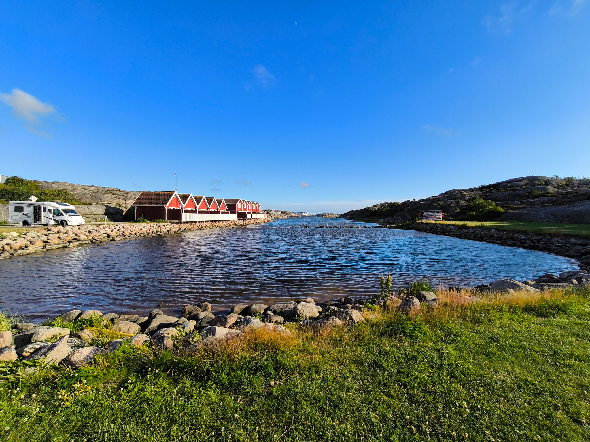 Zum guten Glück ist das Wetter an diesem Nachmittag hervorragend. Es ist seit langer Zeit wieder einmal richtig warm und sonnig, sodass ich vor dem Camper die Sonne geniessen kann. Ich mache mich trotzdem noch auf den Weg und erkunde den kleinen Ort hinter dem Camping. Dieser stellt sich, wie überall hier an der Küste, als ein alter kleiner Fischerort heraus, welcher komplett in eine Ferienanlage umgebaut wurde. Jeder ehemalige Fischerschuppen ist eine Ferienwohnung. An den Hängen wurden die Häuser zu regelrechten Ferienvillen renoviert. Alles ist perfekt in Schuss. An der Strasse steht eine fast unendliche Reihe der für Schweden typischen Briefkästen. So stellen sich die Städter aus Göteborg und die wohlhabenden Norweger Urlaubsidylle vor. Die kleinen ehemaligen Fischerorte sind im Kern also fast ausschliesslich Feriensiedlungen mit wenigen realen Einwohnern. Das war wenigstens mein Eindruck. Für die Handwerker und Gärtner ist das wohl ein sehr gutes und einträgliches Geschäft, die nur sehr wenige Wochen im Jahr benutzten Ferienhäuser in Schuss zu halten… Sie wohnen etwas ausserhalb, wo es mehr Platz für ein schönes Haus gibt. Es braucht hier also schon ein Naturschutzgebiet, um auf nicht privatem Gelände etwas unternehmen zu können.