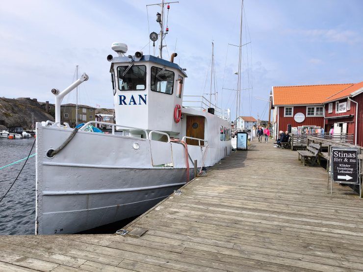 Da es immer noch trocken war und die Sonne auch mal zwischen den Wolken durchlugte, machte ich mich am späteren Nachmittag noch auf den recht kurzen Weg (etwa 20 Minuten) vom Campingplatz nach Fjällbacka. Dort konnte ich die vielen alten Häuser und den Hafen bestaunen. Am Hafen habe ich mir beim Fischdelikatessenhändler eine Portion geräucherte Lachsstücke für den nächsten Tag gekauft. Die Auswahl im Laden war sehr verlockend!