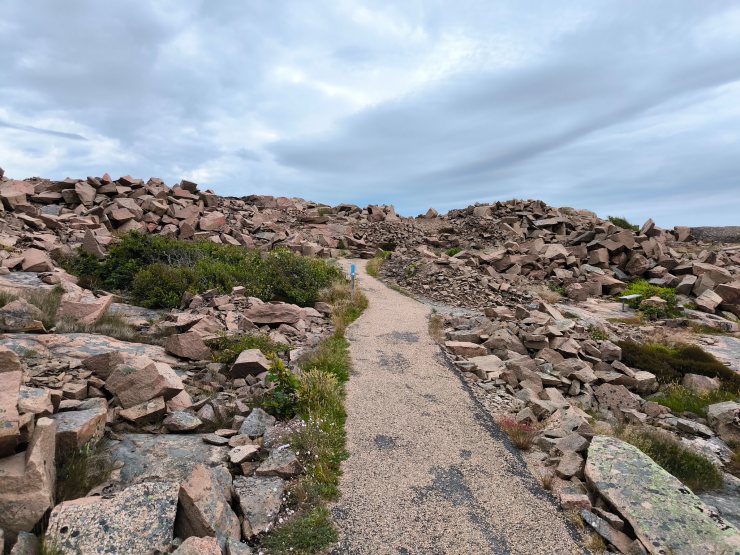 Die rundgeschliffenen, rostbraunen oder roten Granitfelsen sind mit einigen Wanderwegen durchzogen. Es geht rauf und runter über die kargen Felsen, manchmal sogar mit Geländer. Weisse Farbstriche kennzeichnen den Weg. An die genialen Ausblicke habe ich mich schon fast gewöhnt. Im Windschatten der Felsen war es recht angenehm, im stürmischen Wind war es schon ziemlich kühl. Trotzdem habe ich fast alle Wege abgelaufen und konnte sogar eine Fotosession einer Hochzeit beim ikonischen weissen Haus des ehemaligen Leuchtturms auf den Felsen mitverfolgen. Während den rund 90 Minuten unterwegs auf und zwischen den Felsen haben mich nur einmal ein paar wenige Regentropfen erreicht. Diese Phasen konnte ich gut auf einer der zahlreichen Bänke im Windschatten eines Felsens abwarten.