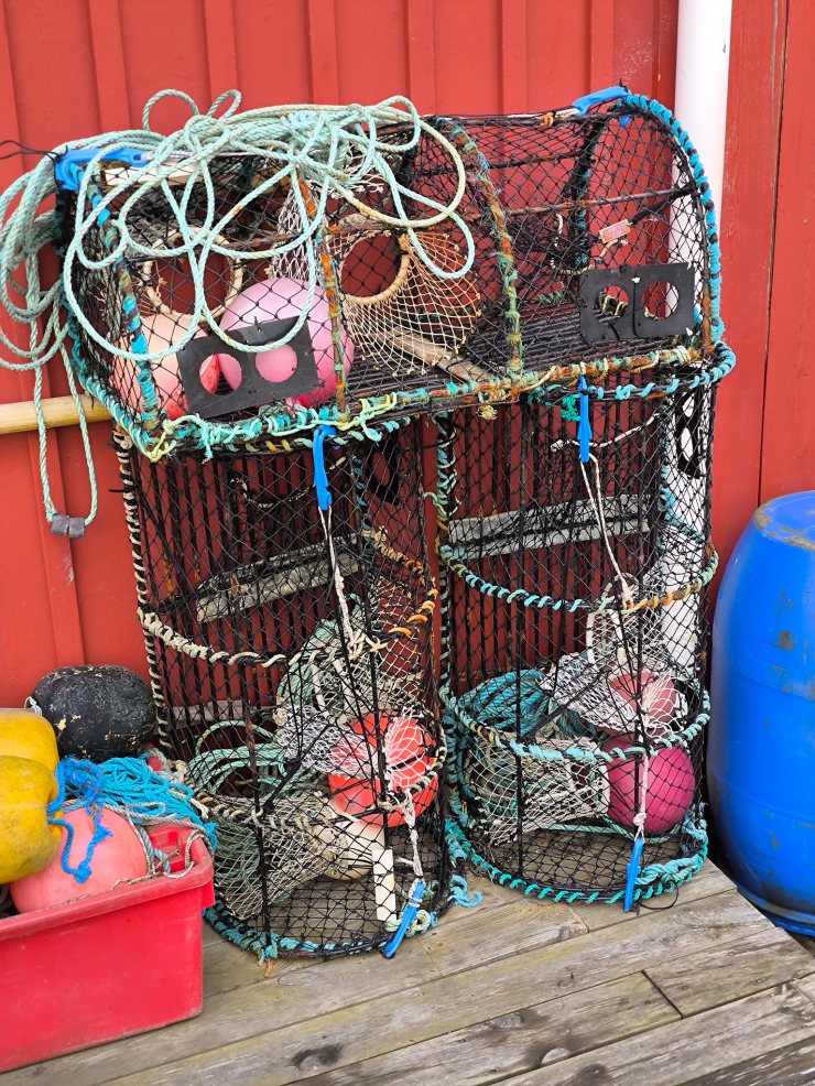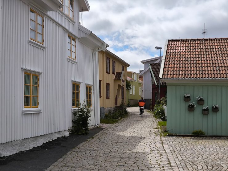 Am Freitagmorgen war zuerst eine Runde Wäschewaschen und -trocknen angesagt. Die grossen professionellen Maschinen machten ihren Job für die SEK 70.- perfekt. Da das Wetter nach dem Trocknen der Wäsche im Trockner immer noch überraschend schön war, holte ich das Fahrrad vom Träger, packte das Regenzeug in den Rucksack und machte mich gegen den fiesen Wind über die hügelige Strasse auf die 6km lange Strecke nach Smögen. Dort angekommen, konnte ich die Bryggan, die kleinen mit Steinen gepflasterten Strässchen und die vielen alten Holzhäuser bei Sonnenschein geniessen. Da es Mittagszeit war, hatte ich Hunger. Ich wollte aber nicht im vollsten Touristenrestaurant etwas essen, und auch nicht in einem leeren, sondern in einem der beiden ursprünglichen Fischdelikatessenläden. Ich entschied mich für Smögens Havsdelikatesser. Dort entschied ich mich für Fish&Chips, welche ich auf der Terrasse vor dem Laden stilgerecht vertilgen konnte. Das war sehr lecker! Danach war ich so gut gestärkt, dass ich mit dem Fahrrad noch auf die andere Seite des Gästehafens fuhr und von dort dann mit Rückenwind die gut 7km zurück zum Campingplatz fuhr.