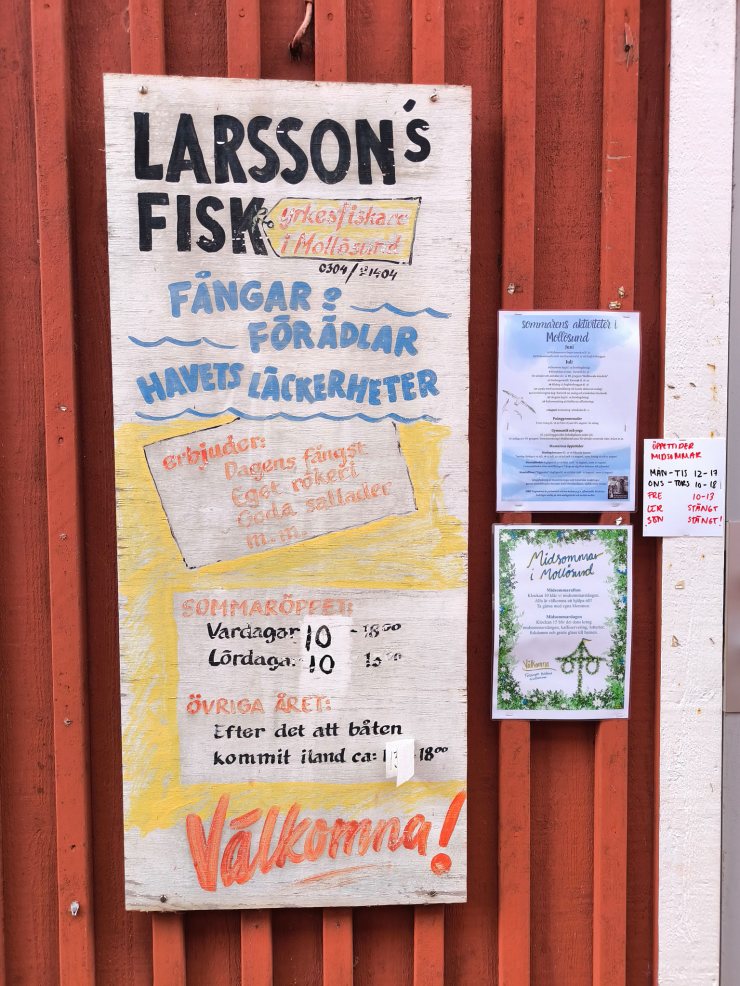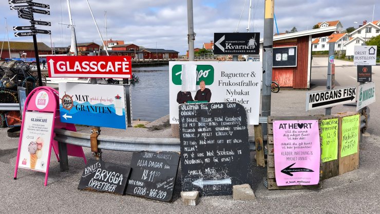 Auf meiner Fahrt über Orust und Tjörn habe ich zuerst den kleinen Fischerort Mollösund besucht. Als allererstes ging ich auf den Aussichtspunkt Klockeberget, wo die Fischerfrau mit ihrem Kind nach ihrem Mann Ausschau hält. Sie war sicher jedesmal wieder froh, wenn er gesund wieder zurück kam. Beim Schlendern durch die „Hauptstrasse“ (Gatan) des Ortes, musste ich feststellen, dass das lauschige Mollösund für mich einer der schönsten Orte in den Schären von Bohuslän ist. Obwohl auch hier im überschaubaren Zentrum viele Ferienwohnungen sind, hat der Ort eine gewisse Ursprünglichkeit bewahrt. Und es gibt sogar mindestens zwei noch aktive Fischer mit Fischläden. Die gingen allerdings erst am Mittag auf, sonst hätte ich gerne etwas eingekauft. Im kleinen Hafen lagen wieder viele tolle Schiffe, die einem von Segelabenteuern träumen liess. Bei den vielen aufgestellten Schildern an der Strassenecke zum Gästehafen könnte man annehmen, hier sei extrem viel los. Das täuscht aber… Ich ging noch auf die andere Seite des Hügels den Katteviks Badplats besuchen, wo ich wieder einmal erstaunt war, dass dieser nur einen Monat lang, von Anfang Juli bis Anfang August, offiziell in Betrieb ist .