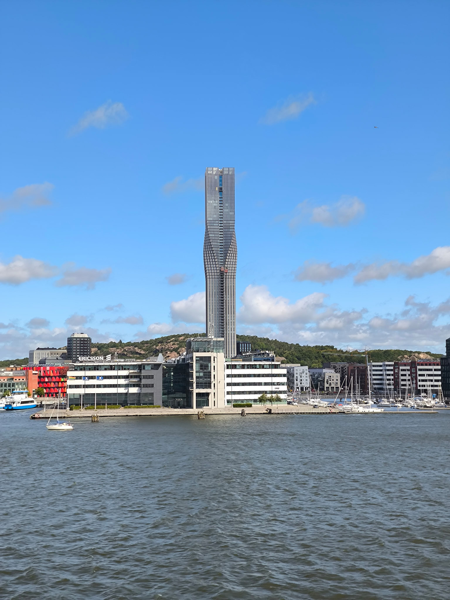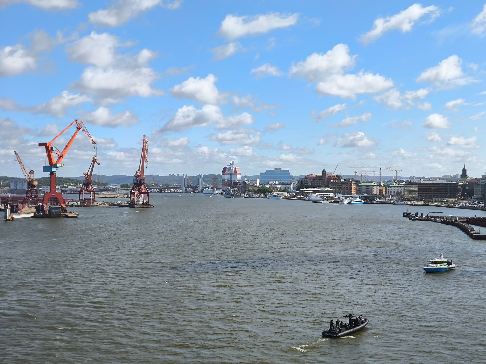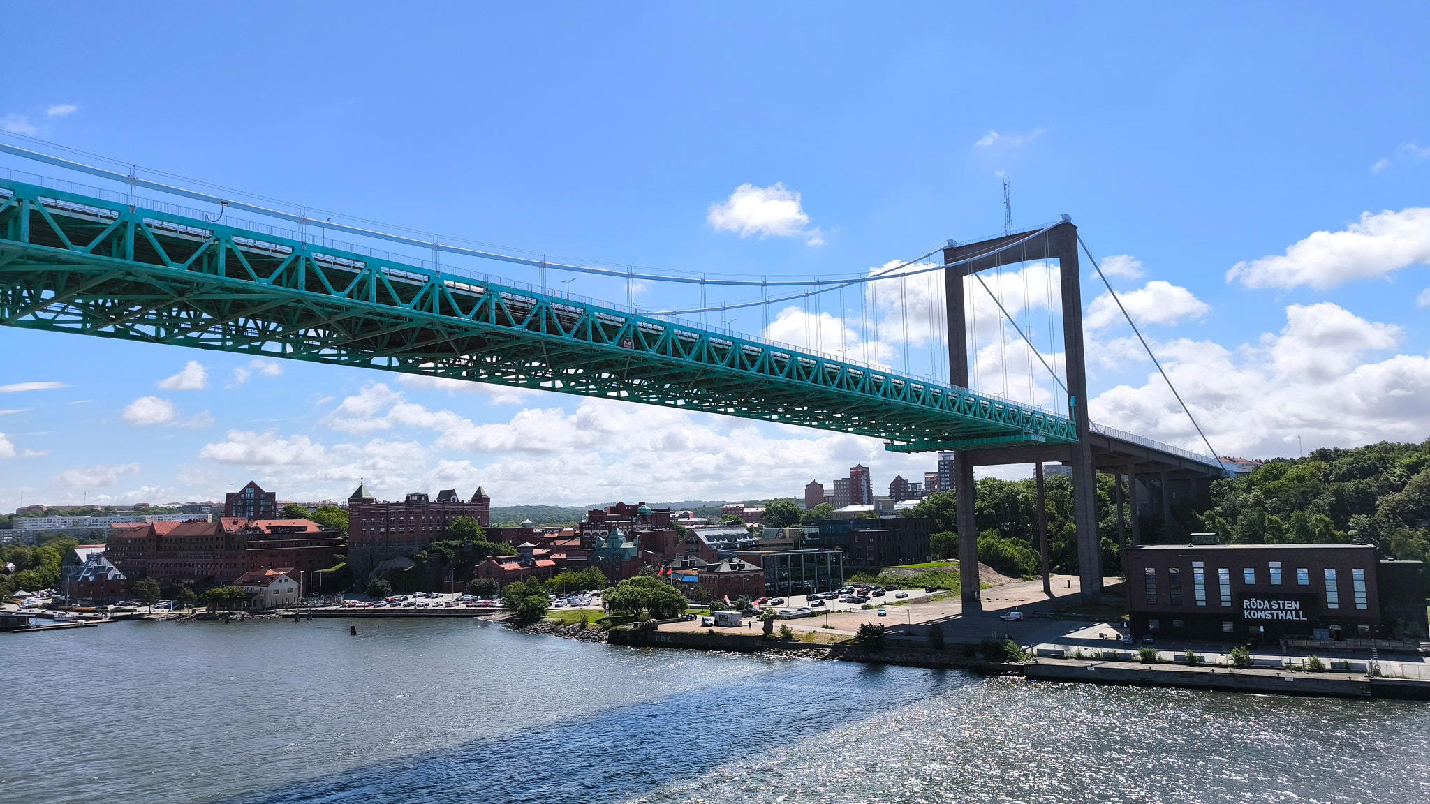 Da es sonniges Wetter war, habe ich mich vor Abfahrt gleich auf das offene Oberdeck begeben. Auf gleicher Höhe wie die Brücke konnte ich noch etwas Sightseeing von Göteborg nachholen.