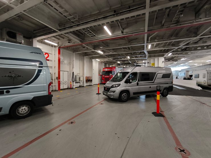 Heute Morgen konnte ich ganz entspannt in einem der Maxi ICA von Göteborg viel Essbares einkaufen und war dann gut eine Stunde vor Abfahrt der Fähre (11 Uhr) beim Check-In, also dreissig Minuten früher als vorgegeben. Dort war ich dann aber der letzte Camper in der recht ansehnlichen Reihe. Das hat sich dann aber als Glücksfall herausgestellt, da ich mich nach der Rampe in das obere Deck hinten in der Fähre mit zwei oder drei anderen Wohnmobilen sozusagen frei aufstellen konnte, ohne mich in eine der Reihen beidseits der Rampe einsortieren zu müssen. Das hatte dann den Vorteil, dass drei Wohnmobile als allererste (sogar noch vor den Autos) die Rampe runterfahren und die Fähre verlassen durften. Das ging so schnell, dass auf dem Hafengelände in Frederikshavn sogar noch das grosse Tor zu war.