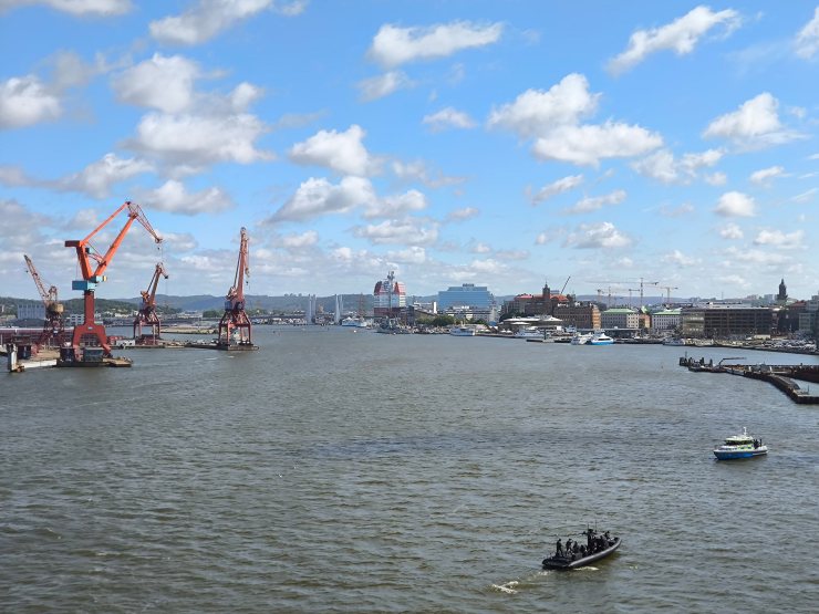Da es sonniges Wetter war, habe ich mich vor Abfahrt gleich auf das offene Oberdeck begeben. Auf gleicher Höhe wie die Brücke konnte ich noch etwas Sightseeing von Göteborg nachholen.