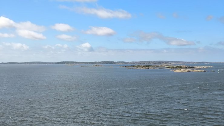 Neben einem Deck voller unnützer Kabinen (bei 3h45′ Fahrtdauer) gibt es auf der Stena Vinga nur wenige Sitzplätze, ein sehr kleiner Shop und ein Bordrestaurant. Die Fähre wurde in 19 Jahren schon auf ein paar Routen eingesetzten und mehrfach umgebaut, meint Wikipedia. Daher wohl diese Konfiguration. Etwa die Hälfte der Sitzplätze kann man nur gegen Aufpreis nutzen. Na, dann habe ich halt auf den „billigen Plätzen“ mein Mittagessen eingenommen. Mich hat der günstige Preis überrascht: Für eine grosse Portion Fish&Chips habe ich nur SEK 210 (rund CHF 18) bezahlt. Da es wunderbares Wetter war, habe ich den kurzen Rest der Fahrt dann draussen in der Sonne (einigermassen) im Windschatten hinter mich gebracht.
