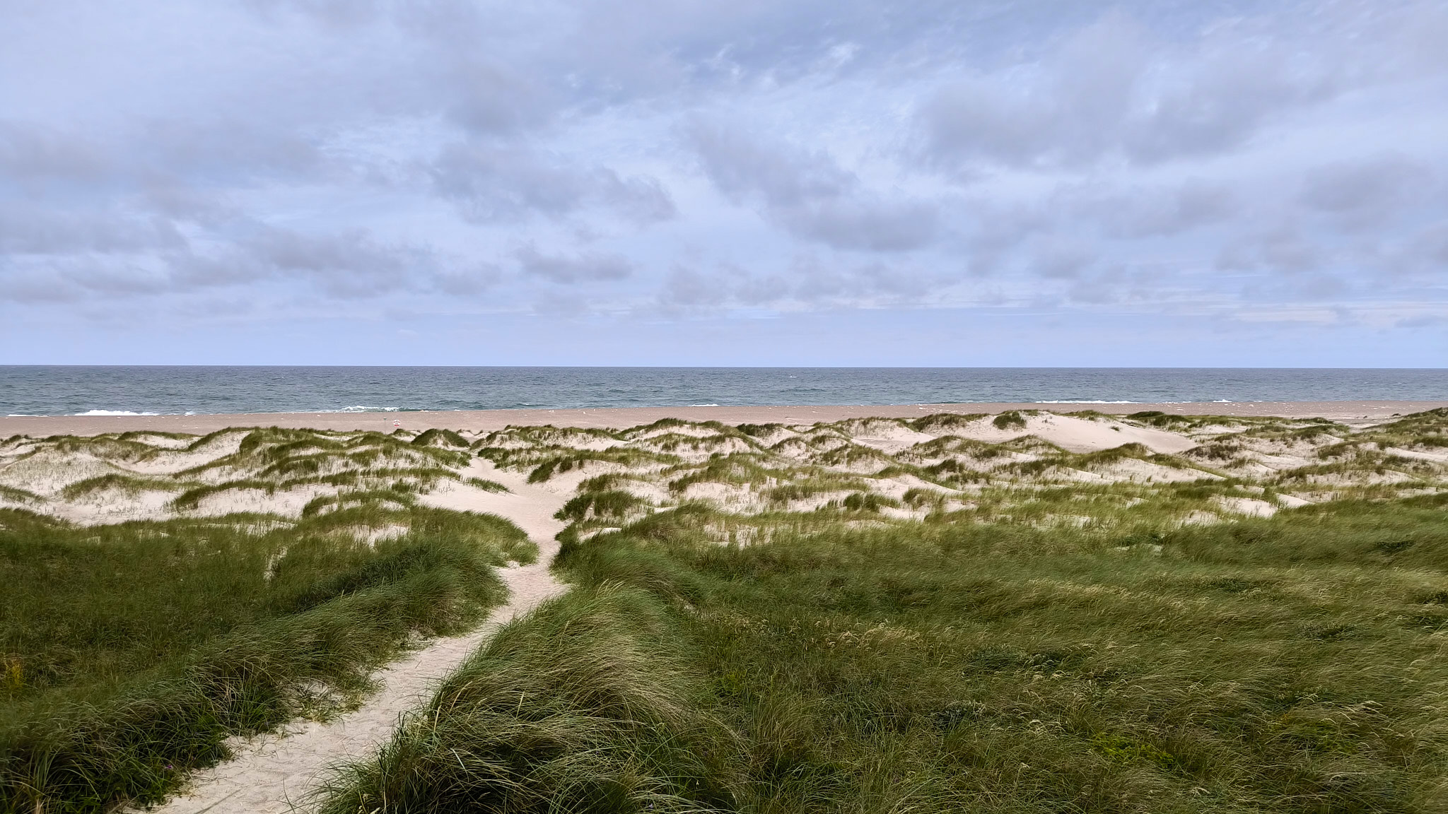 In Nr. Vorupör angekommen, war praktischerweise gerade Mittagszeit. Daher kaufte ich mir in der kleinen Vorupør Røgeri eine „Platte mit allem“ (geräucherter Lachs, Fischfrikadelle, Matjes, Brot) bei der freundlichen Inhaberin und genoss diesen Lunch vor dem Laden. Gerade gegenüber im Blick war das Nationalparkzentrum Thy, welches man mit sehr, sehr viel Beton in die Düne gebaut hat. Gleich daneben der sehr funktionale Bau des Nordsø Akvariet (Nordseeaquariums). Mein Pfad führte danach aber über einen Schleichweg durch die Dünen zurück zum Campingplatz. Hier hatte ich mir doch einen schönen Bialetti-Mokka verdient, oder?