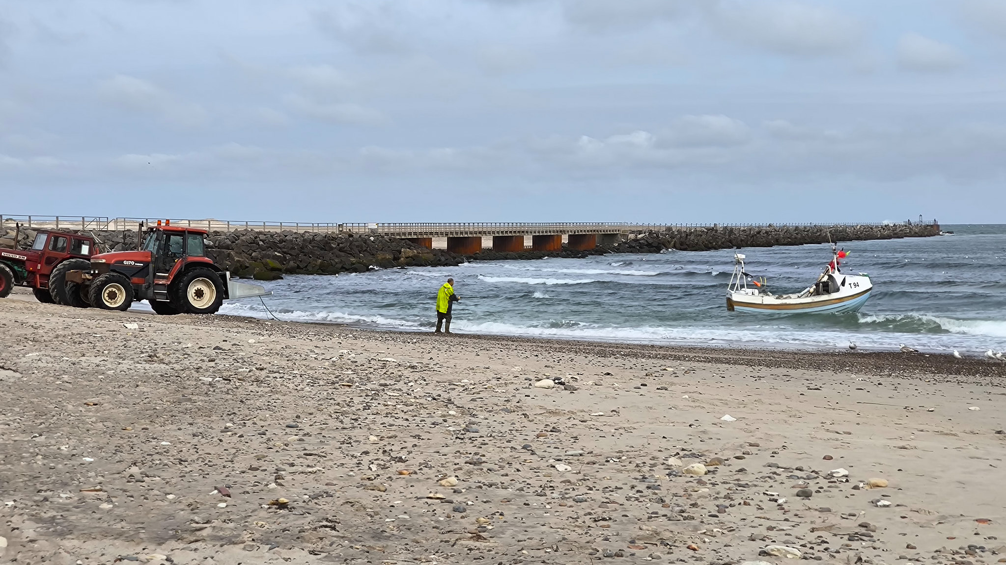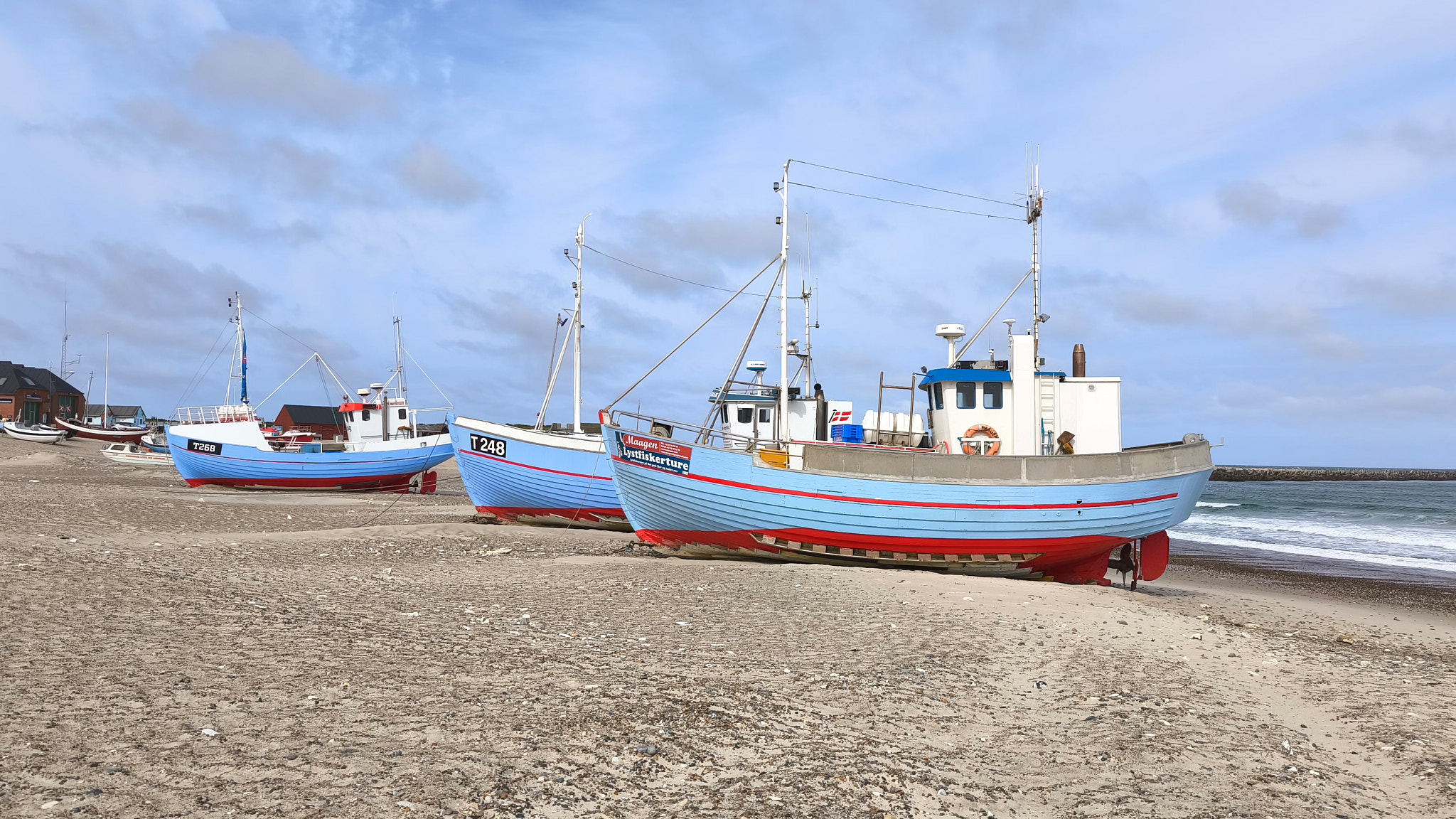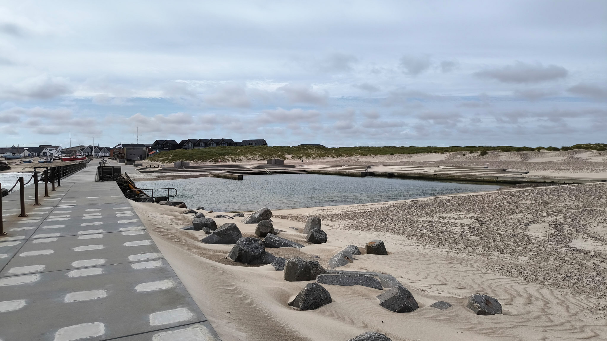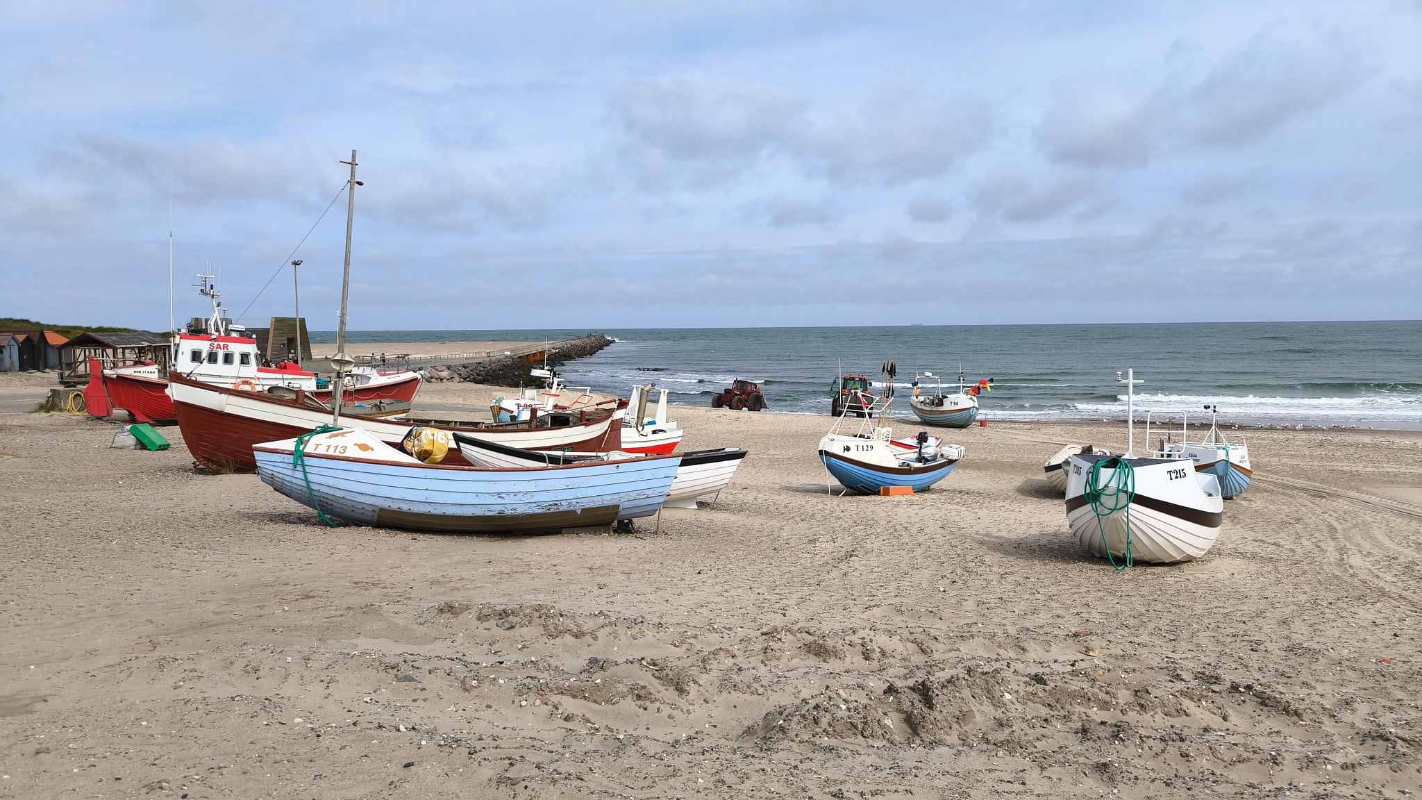 Ich bin vom Campingplatz über die Dünen an den Strand gegangen und habe mich auf den Weg nach Vorupør gemacht. Dort konnte ich die ersten Surfer entdecken, welche Nr. Vorupør als „Cold Hawaii“ bezeichnen. Das Meerwasserschwimmbecken war (wegen Ebbe) halb leer. Am Strand von Nr. Vorupør, wo idyllisch einige kleinere und grössere Fischerboote liegen, konnte ich beobachten, wie ein Fischer sein Boot mit dem Traktor ins Meer zog und dann geschickt das Boot an der Leine zurückzog, einstieg und zum Fischen losfuhr. Denn in Nr. Vorupör wird tatsächlich noch gefischt, und es gibt zwei Läden, welche fangfrische und geräucherte Fische und Meeresfrüchte anbieten. Ansonsten ist der Ort zwar touristisch, aber eher funktional, würde ich behaupten.