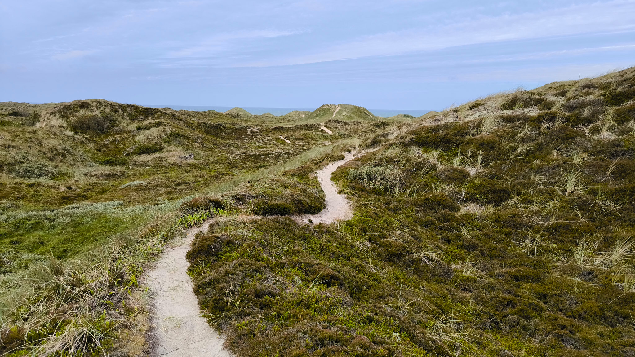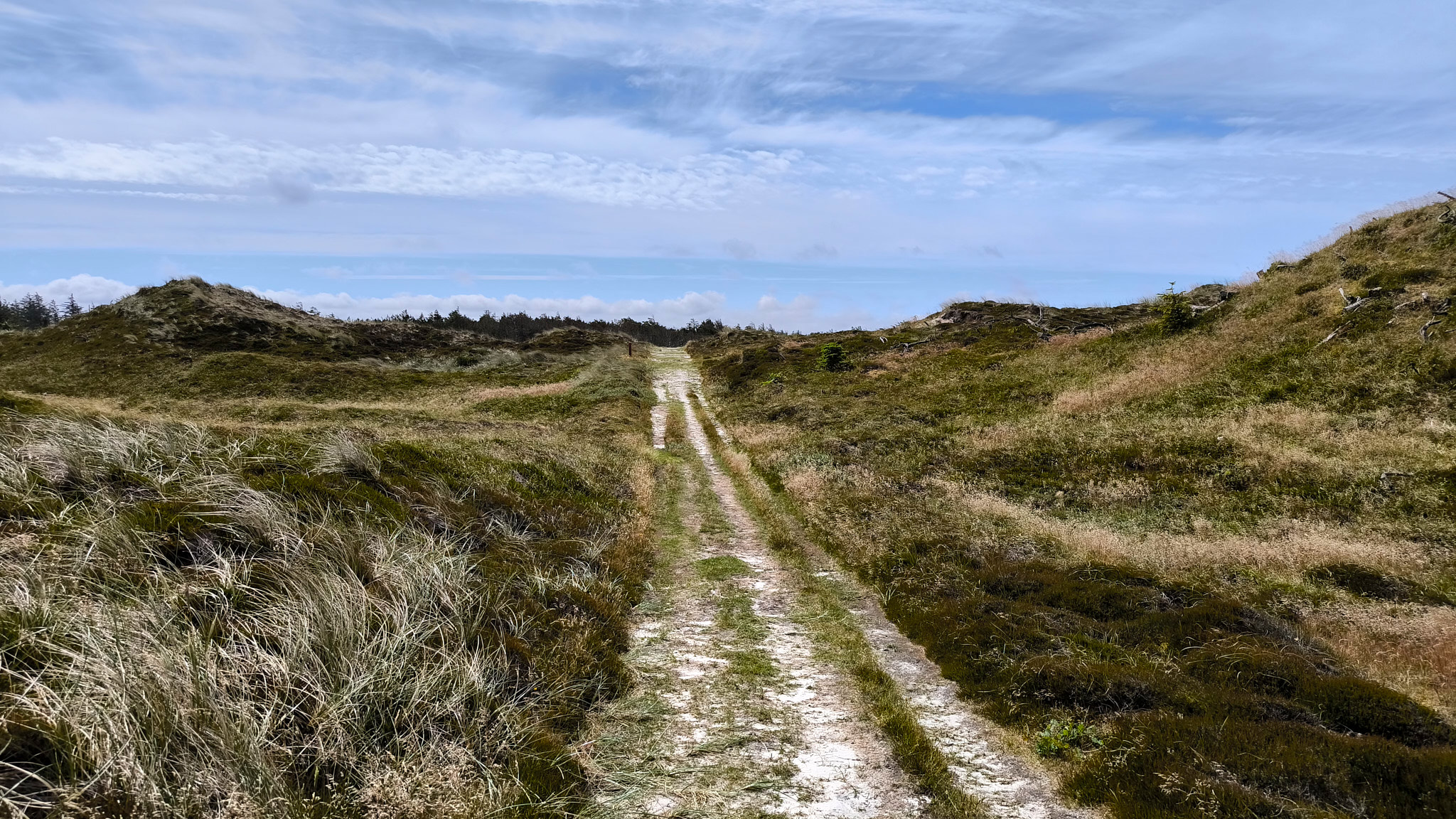 Es war mir dann aber zu langweilig, nur noch auf der Rettungsstrasse (respektive dem Fahrradweg) bis nach Vorupør zu gehen. Deshalb bog ich rechts in einen Dünenweg ab und ging ein ziemlich Stück über, auf und um die Dünen. Das brauchte etwas mehr Kraft und Aufmerksamkeit als der Strand oder die Rettungsstrasse!