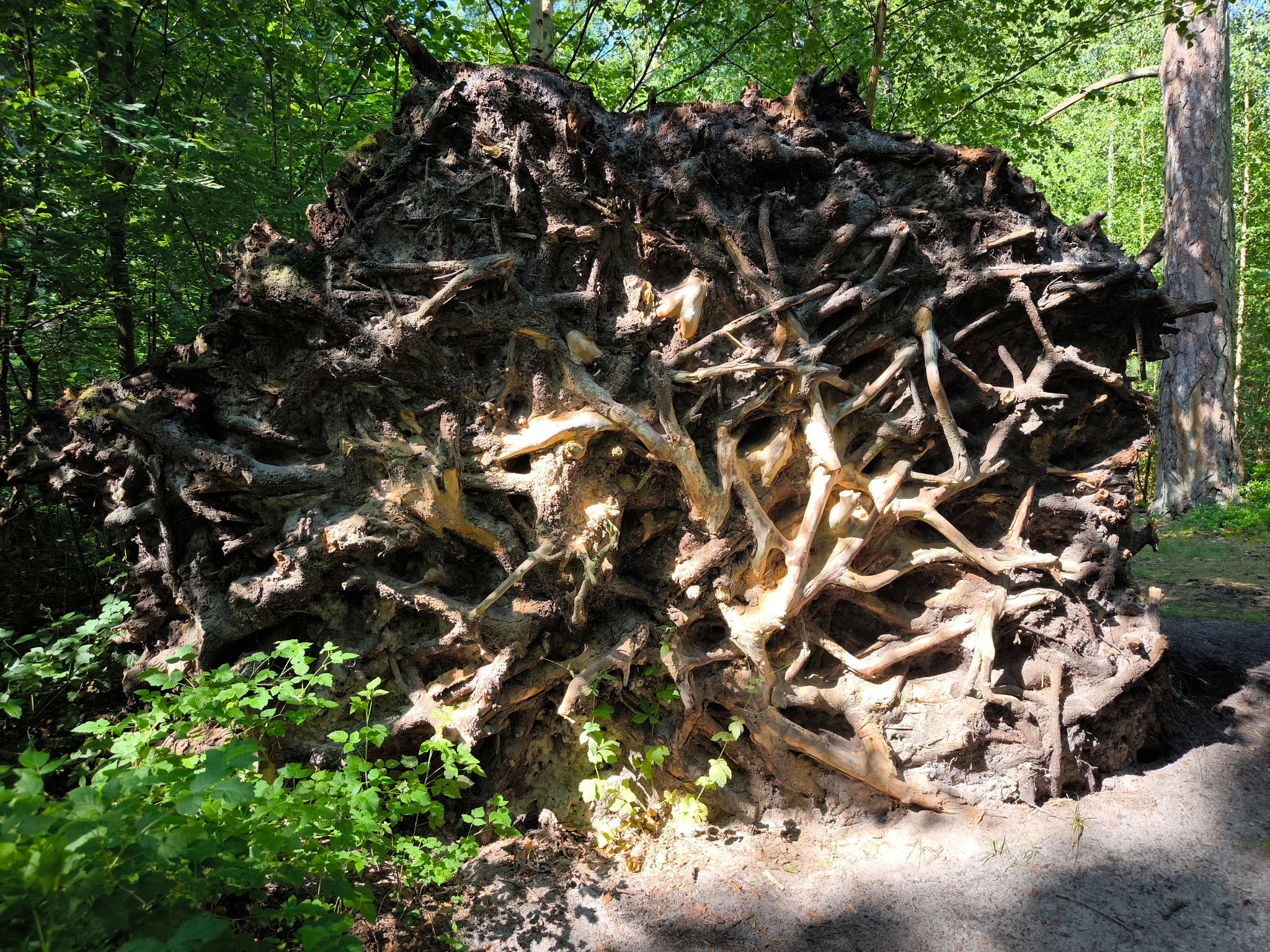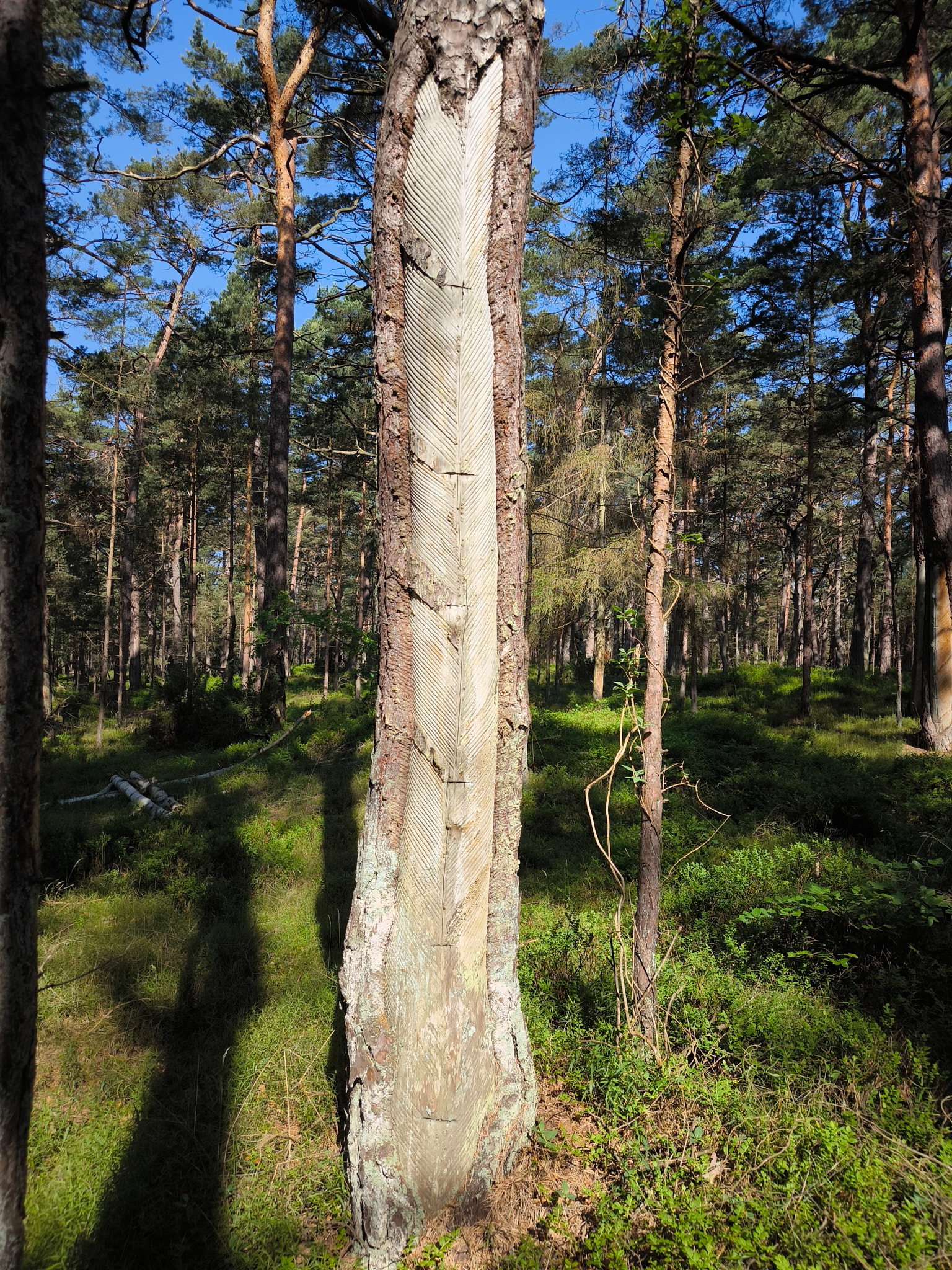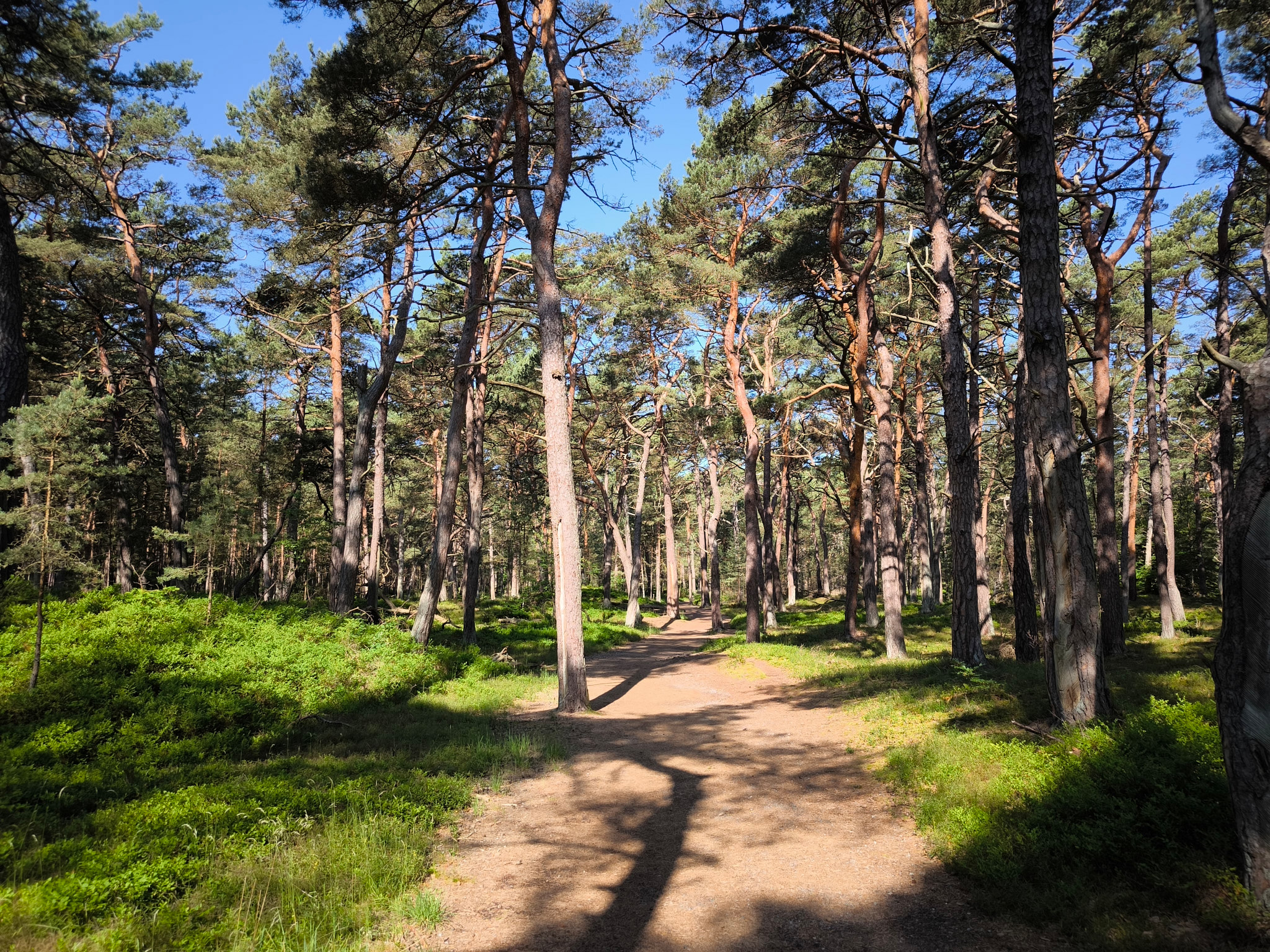 Los geht es über rund 4.5km durch den Darsser Wald bis zum Leuchtturm. Dabei fällt mir als erstes an vielen Kiefernstämmen auf, dass hier früher Kiefernharz gewonnen wurde. Der Weg geht entlang des Kutschenpfades und kreuzt diesen ein paar Mal.
