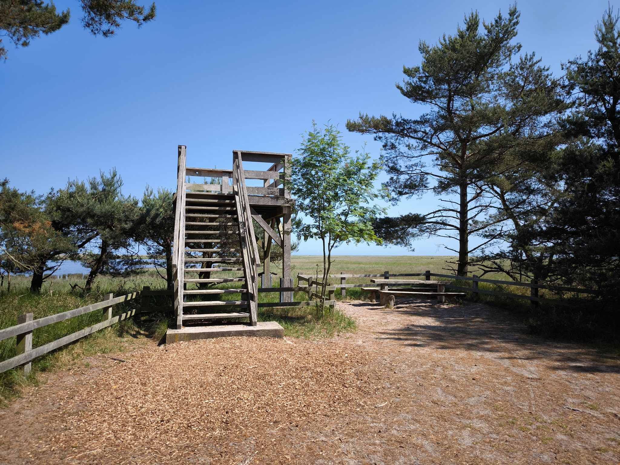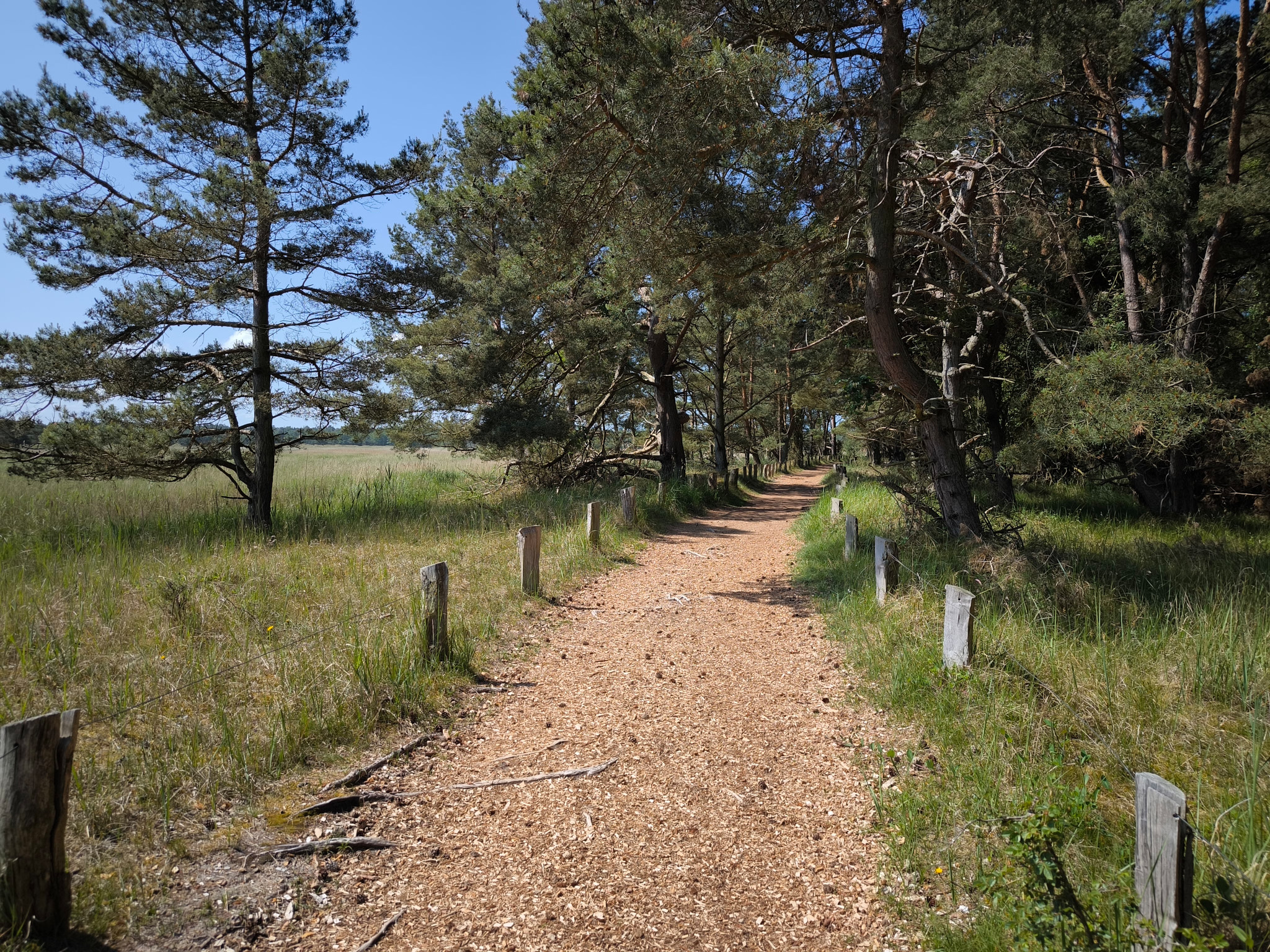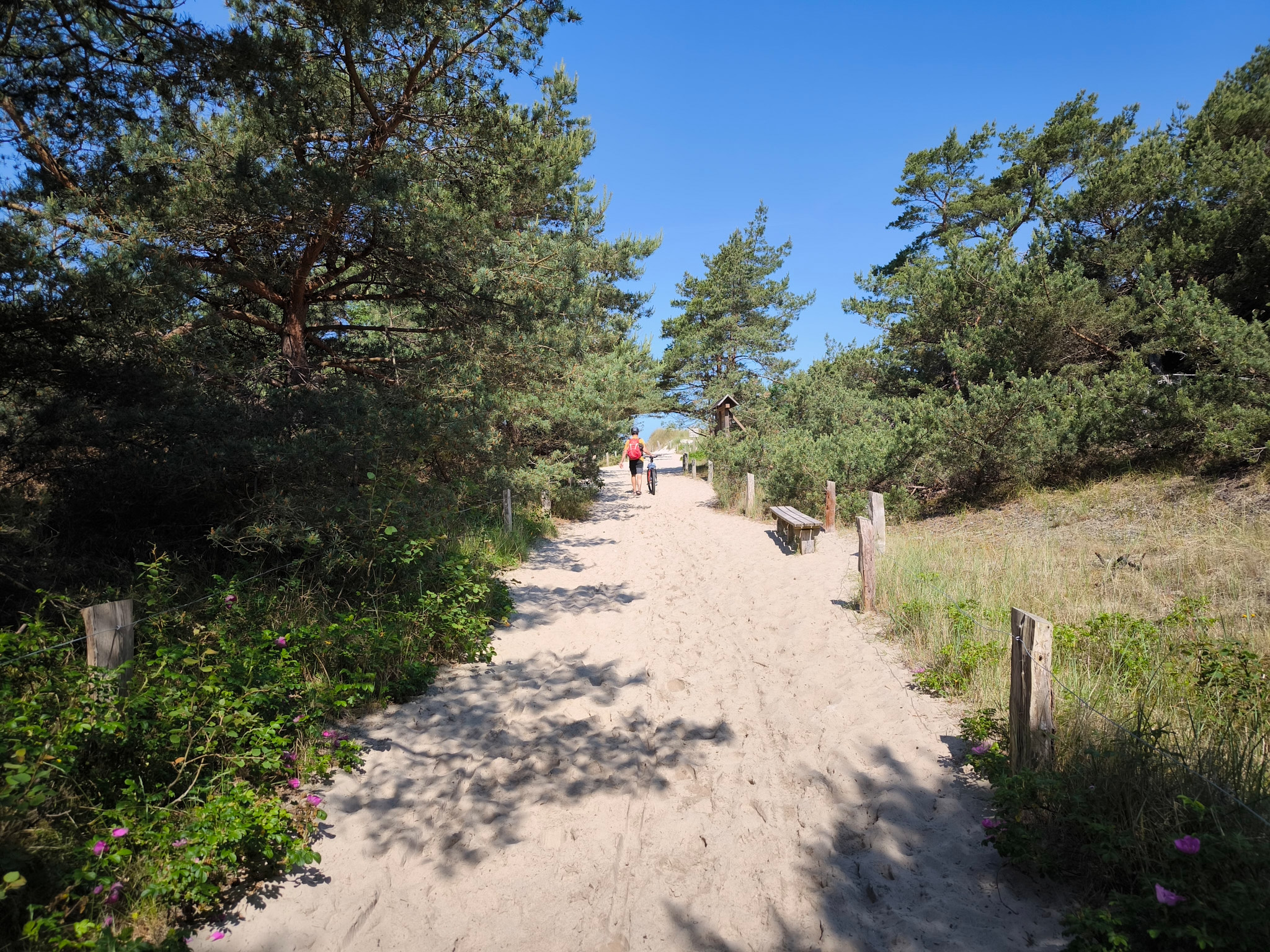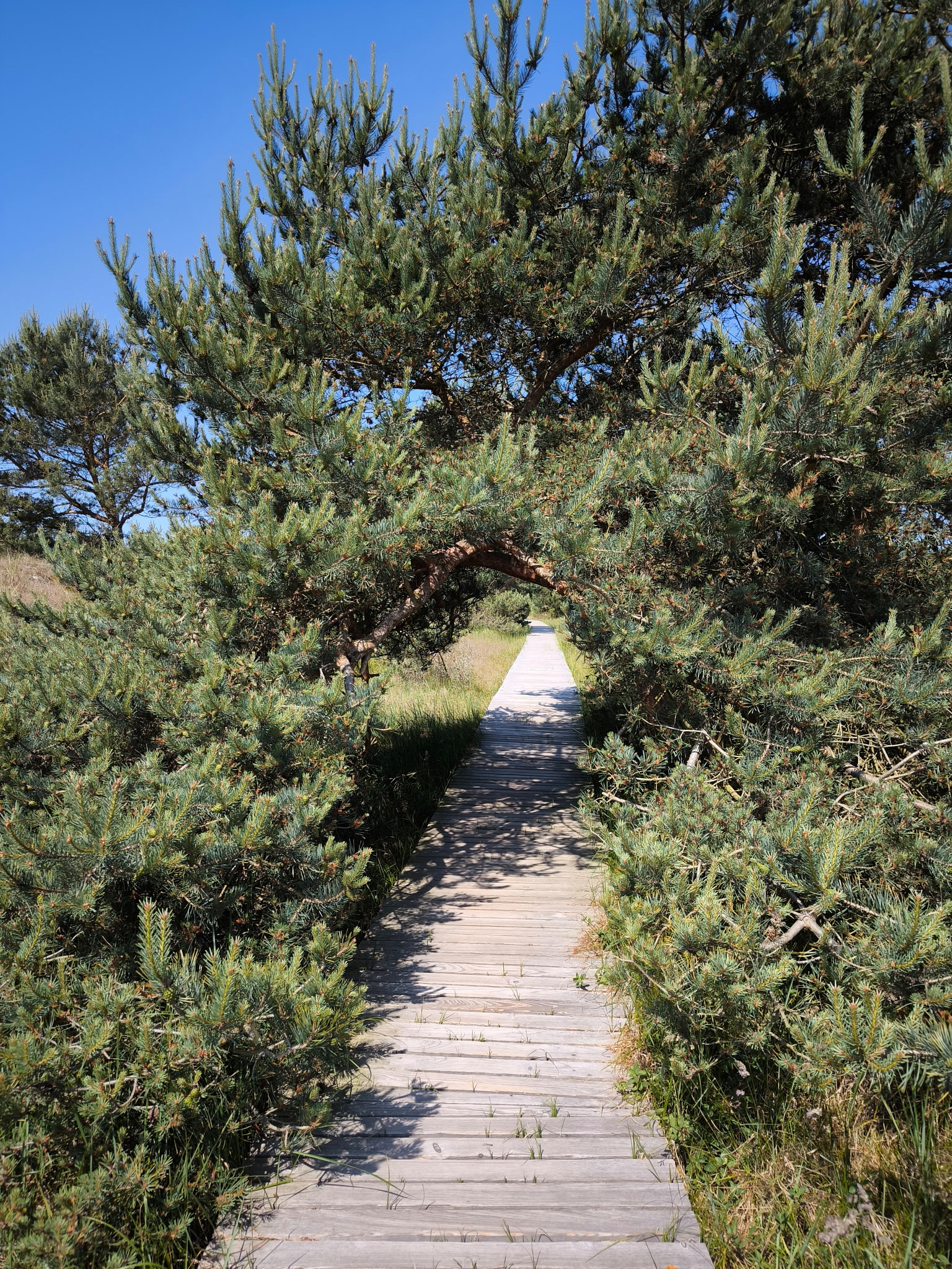 Nun wird es richtig schön, denn es geht auf einem abwechslungsreichen Weg durch die Dünen mit wunderbaren Ausblicken und mehreren Aussichts- und Vogelbeobachtungstürmen auf die andere Seite des Darsser Orts. Der Weg ist ziemlich beliebt, denn besonders auf dem letzten Abschnitt kommen mir einige Leute entgegen!