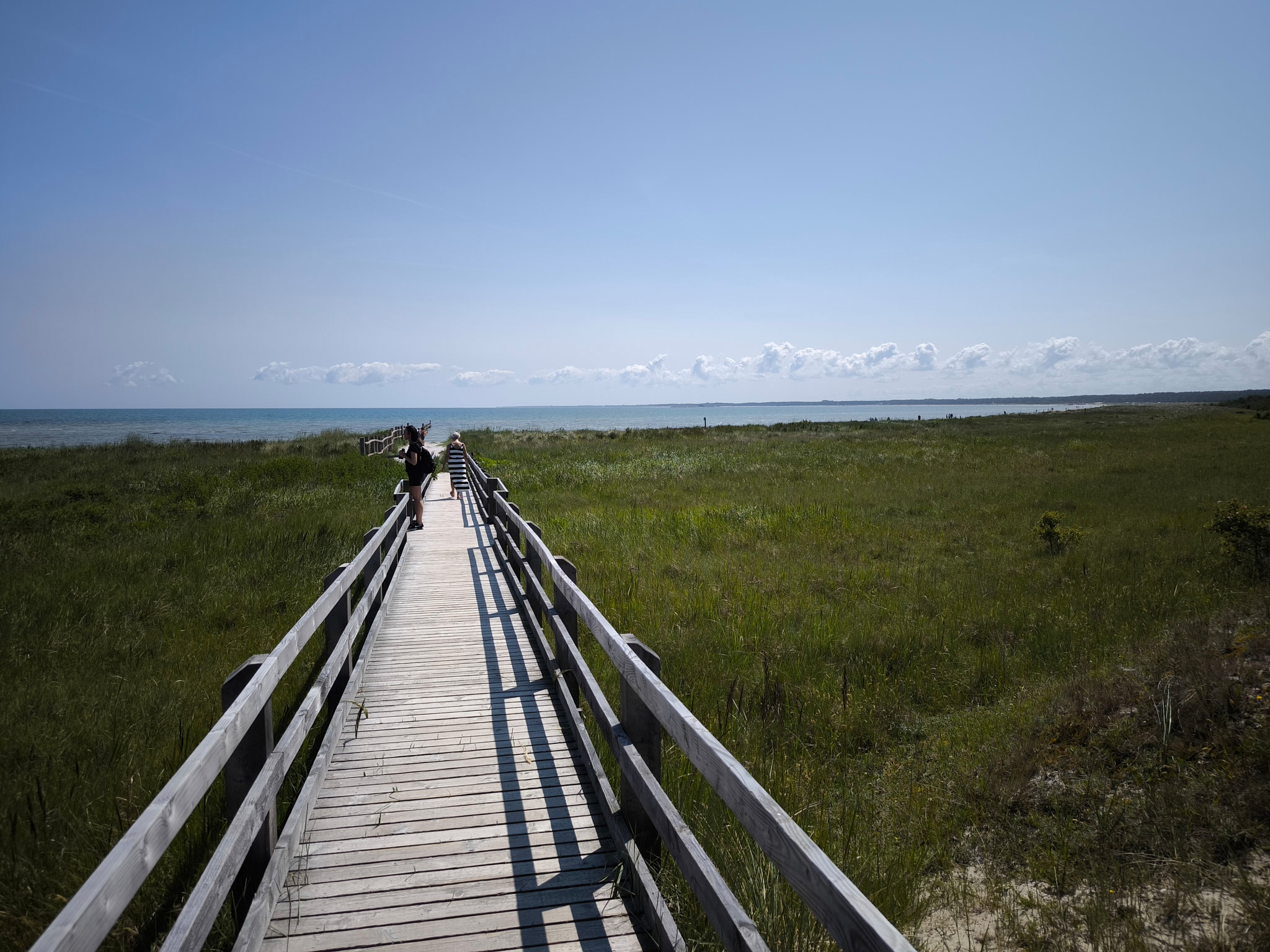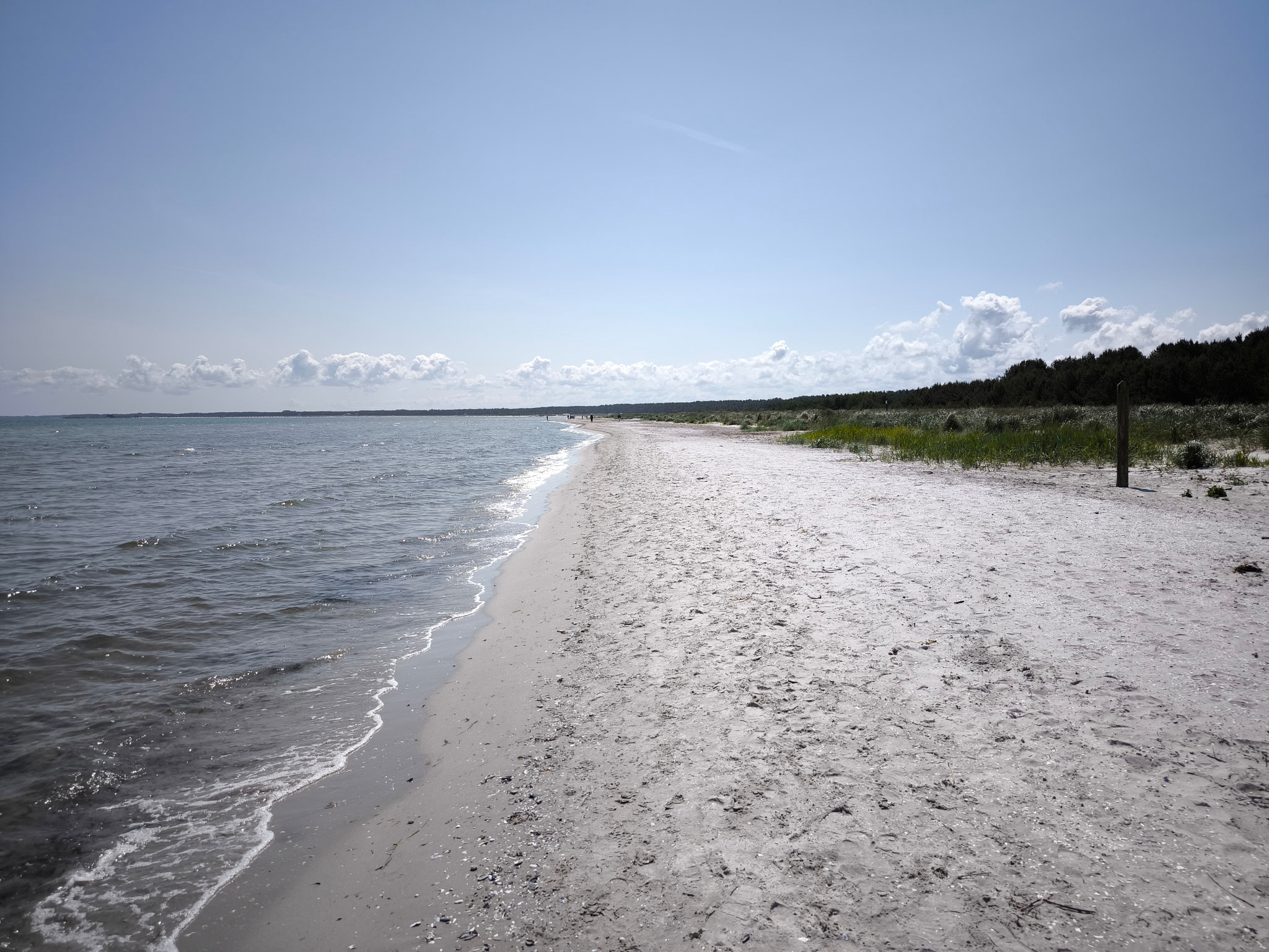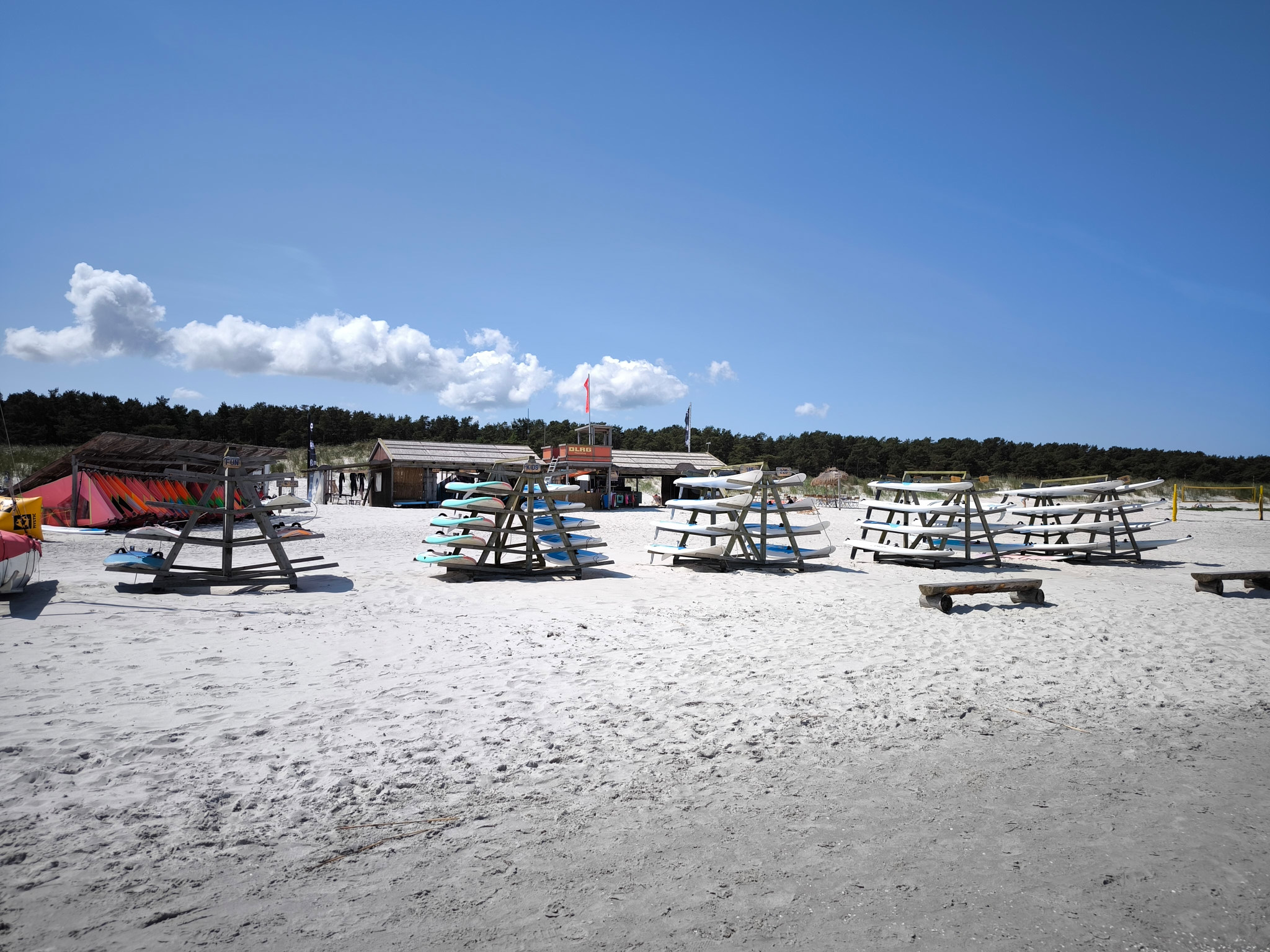 Nun geht es über einen Bohlenweg zum Strand, worauf es über etwa 3km zurück nach Prerow geht. Die letzten etwa 2km geht es auf dem breiten Strand entlang des riesigen, legendären Dünen-Campingplatzes Ahoi Camp Darss, von dem man aber nur ein paar Fahnenmasten sieht.