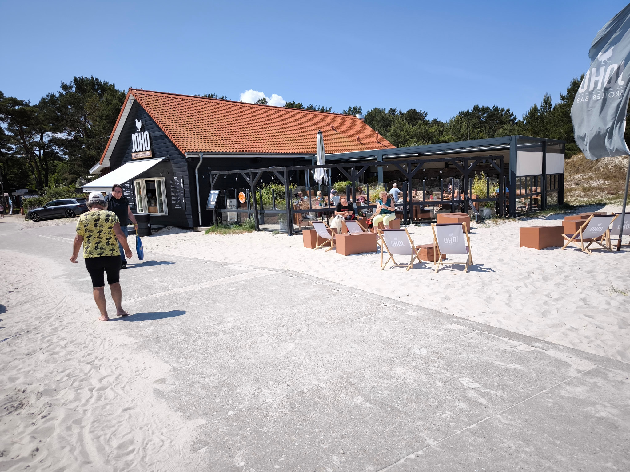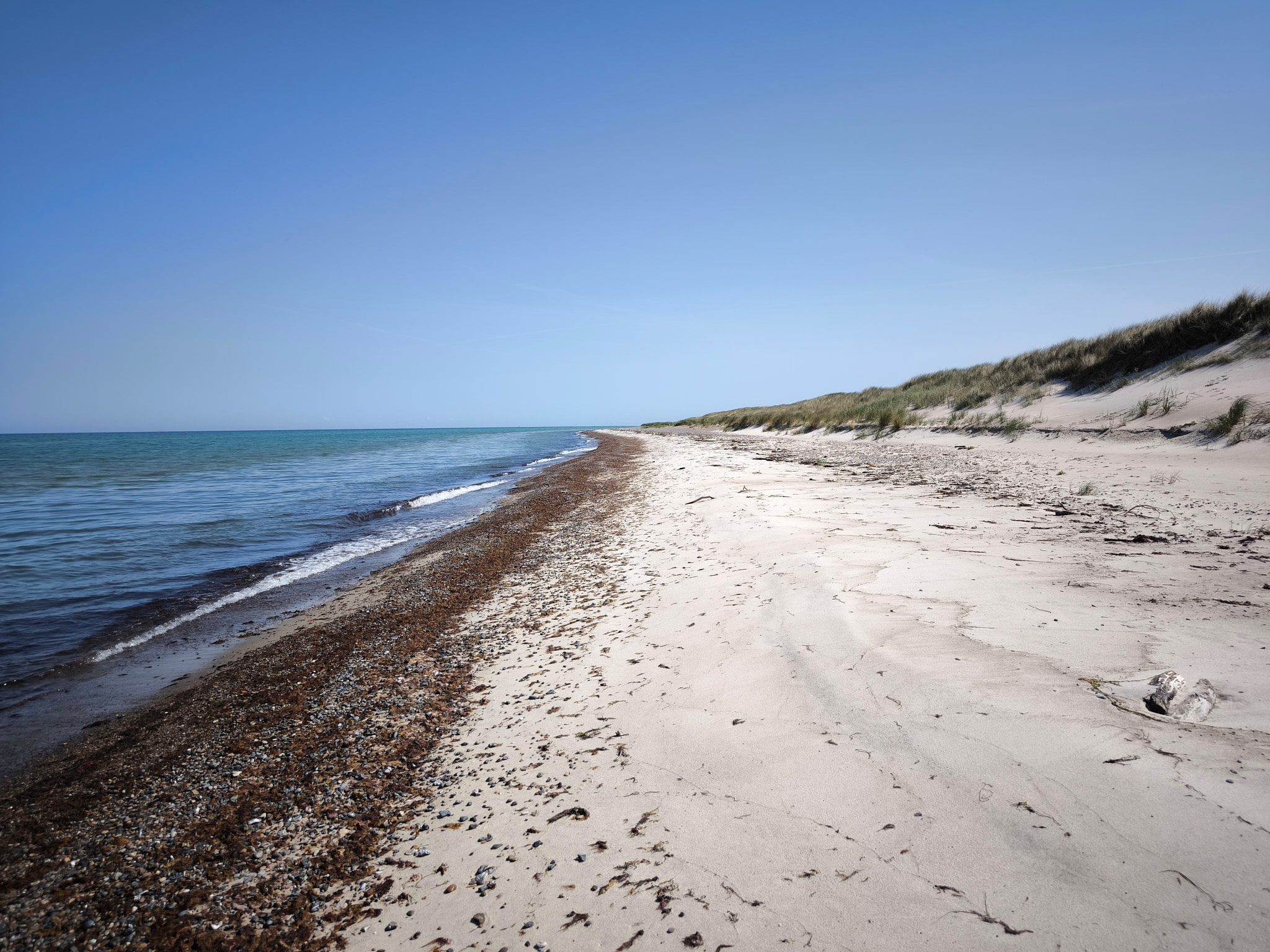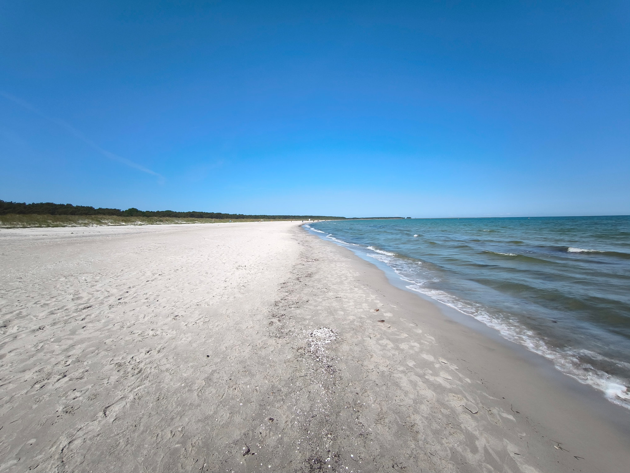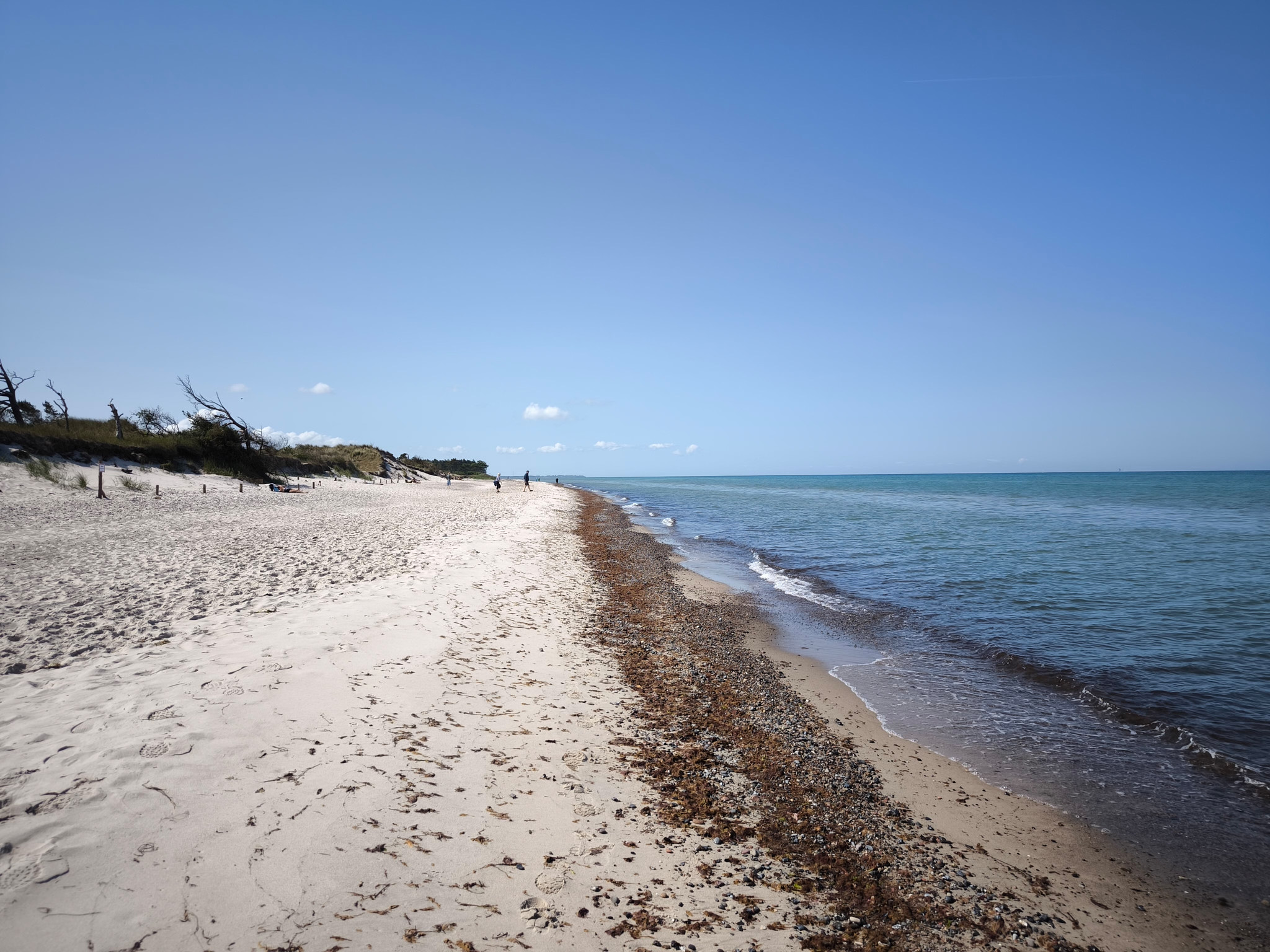 Nun geht es über einen Bohlenweg zum Strand, worauf es über etwa 3km zurück nach Prerow geht. Die letzten etwa 2km geht es auf dem breiten Strand entlang des riesigen, legendären Dünen-Campingplatzes Ahoi Camp Darss, von dem man aber nur ein paar Fahnenmasten sieht.
