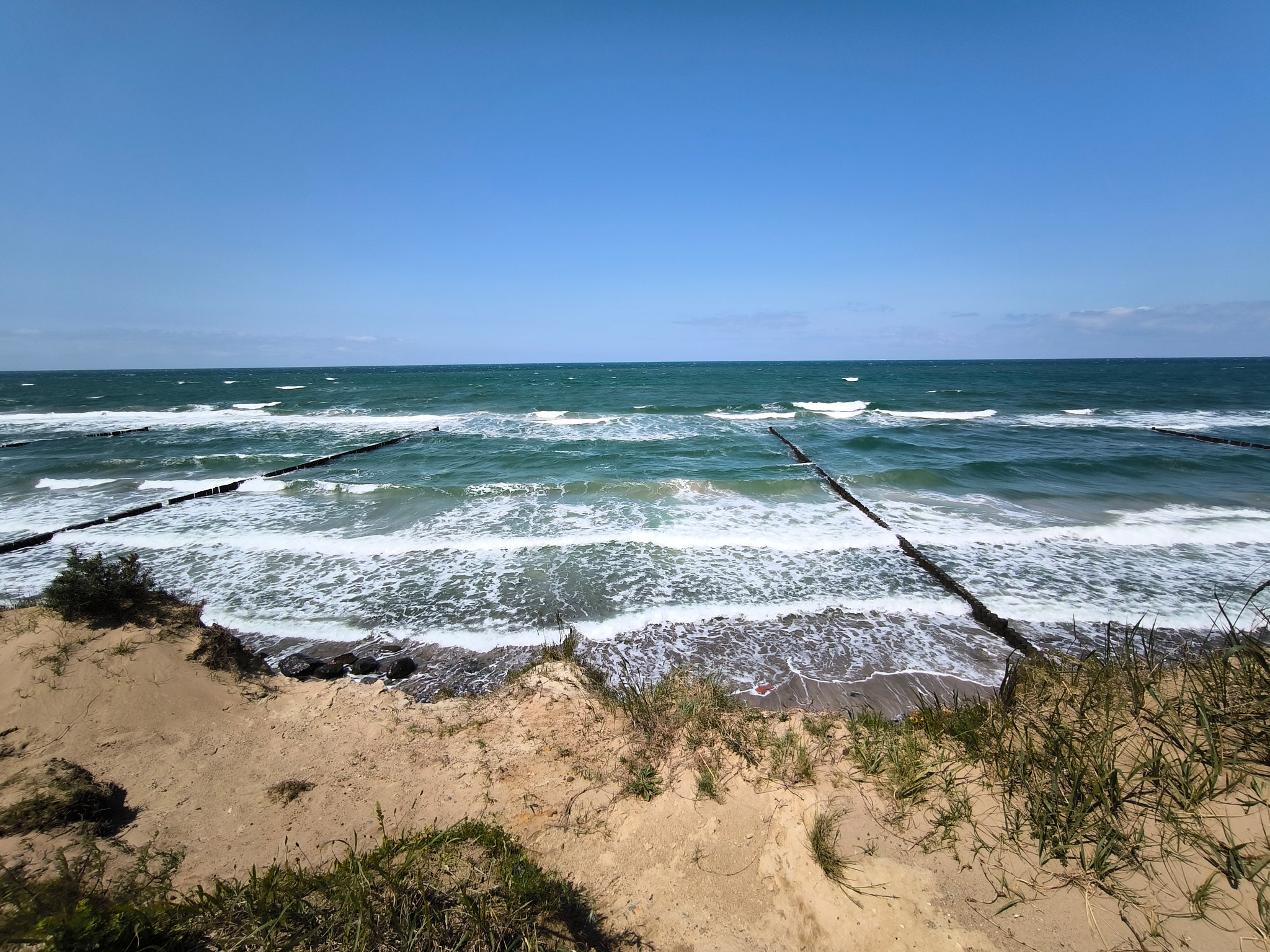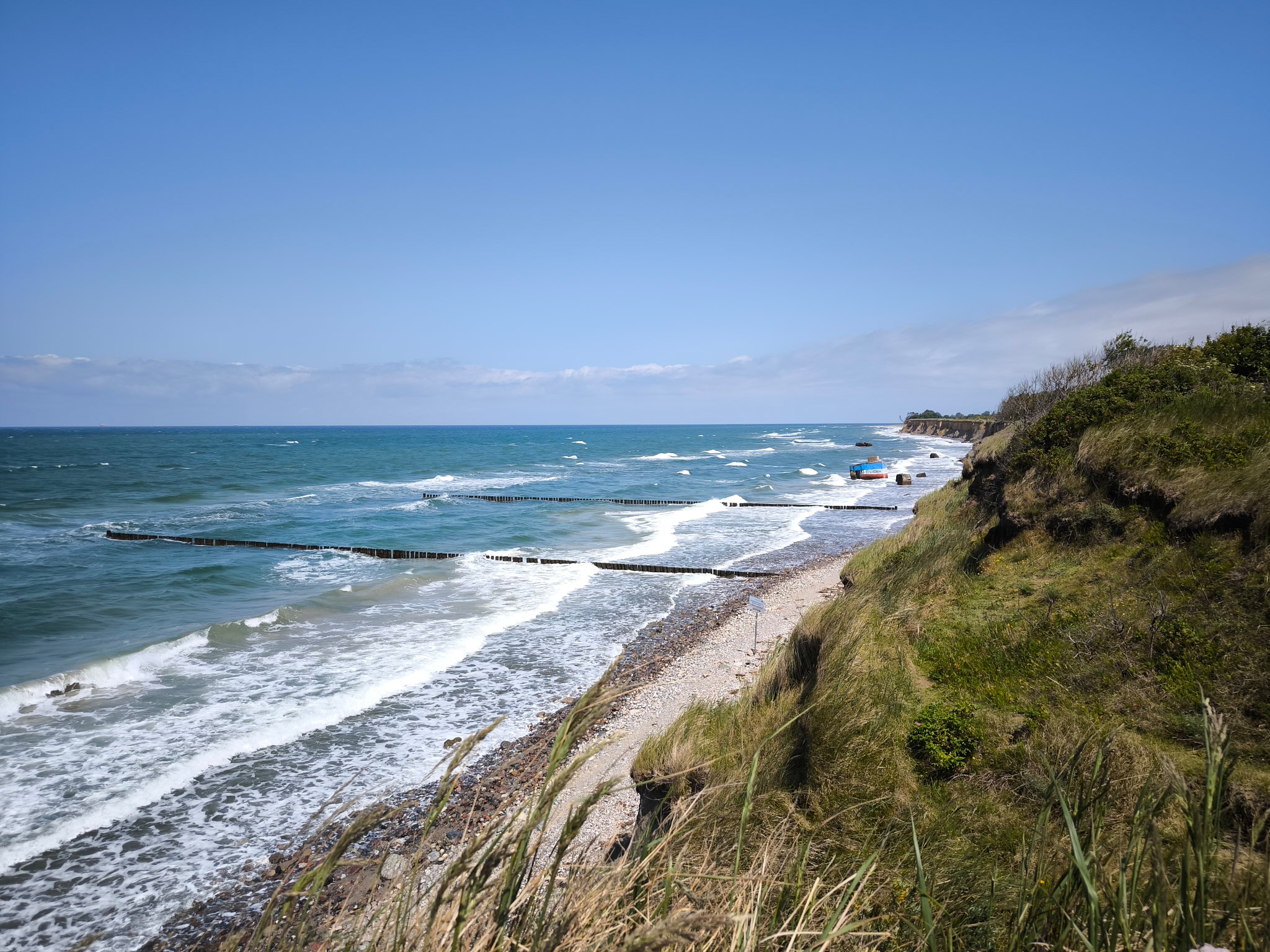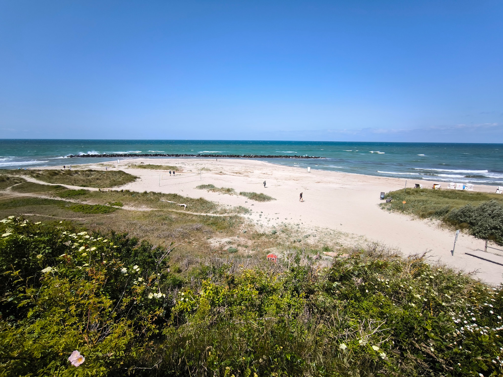 Nach kurzer Zeit komme ich schon auf dem Bakelberg an und geniesse den Ausblick. Mit seinen 18 Metern über dem Meeresspiegel ist er der höchste natürliche Punkt der Halbinsel Fischland-Darss-Zingst. Kurz danach eröffnet sich der Blick auf den Wellenbrecher am Strand von Ahrenshoop.