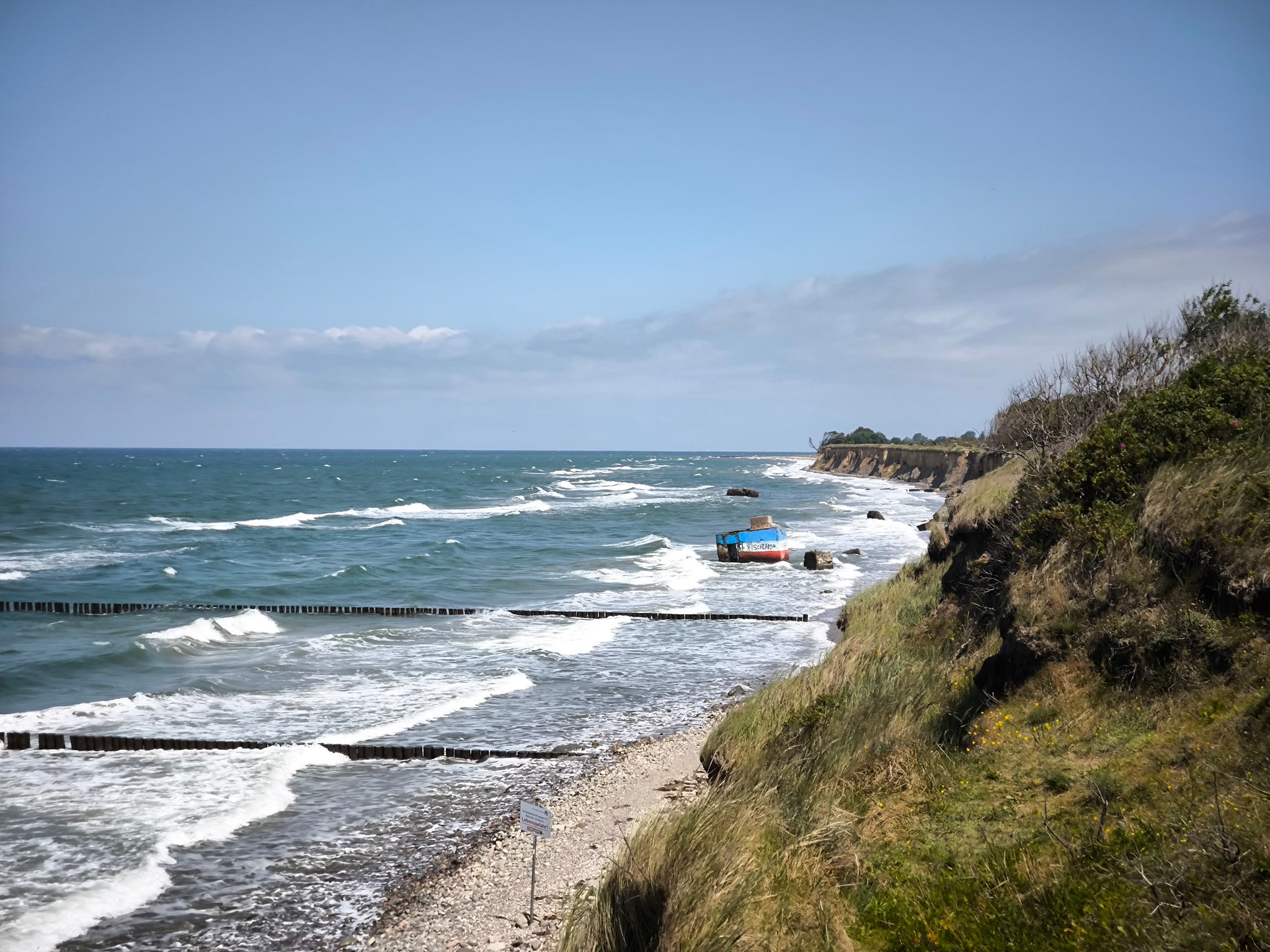 Die Fahr startet nach der Anfahrt durch Wustrow an der Seebrücke und geht zuerst entlang des Strandes und dann des hohen Ufers. Auf der südlichen Seite habe ich einen beeindruckenden Ausblick auf die Wellen und das Steilufer. Weiter Richtung Ahrenshoop führt der Weg allerdings hinter Bäumen durch und man hat eigentlich kaum mehr einen guten Blick auf die Klippen.
