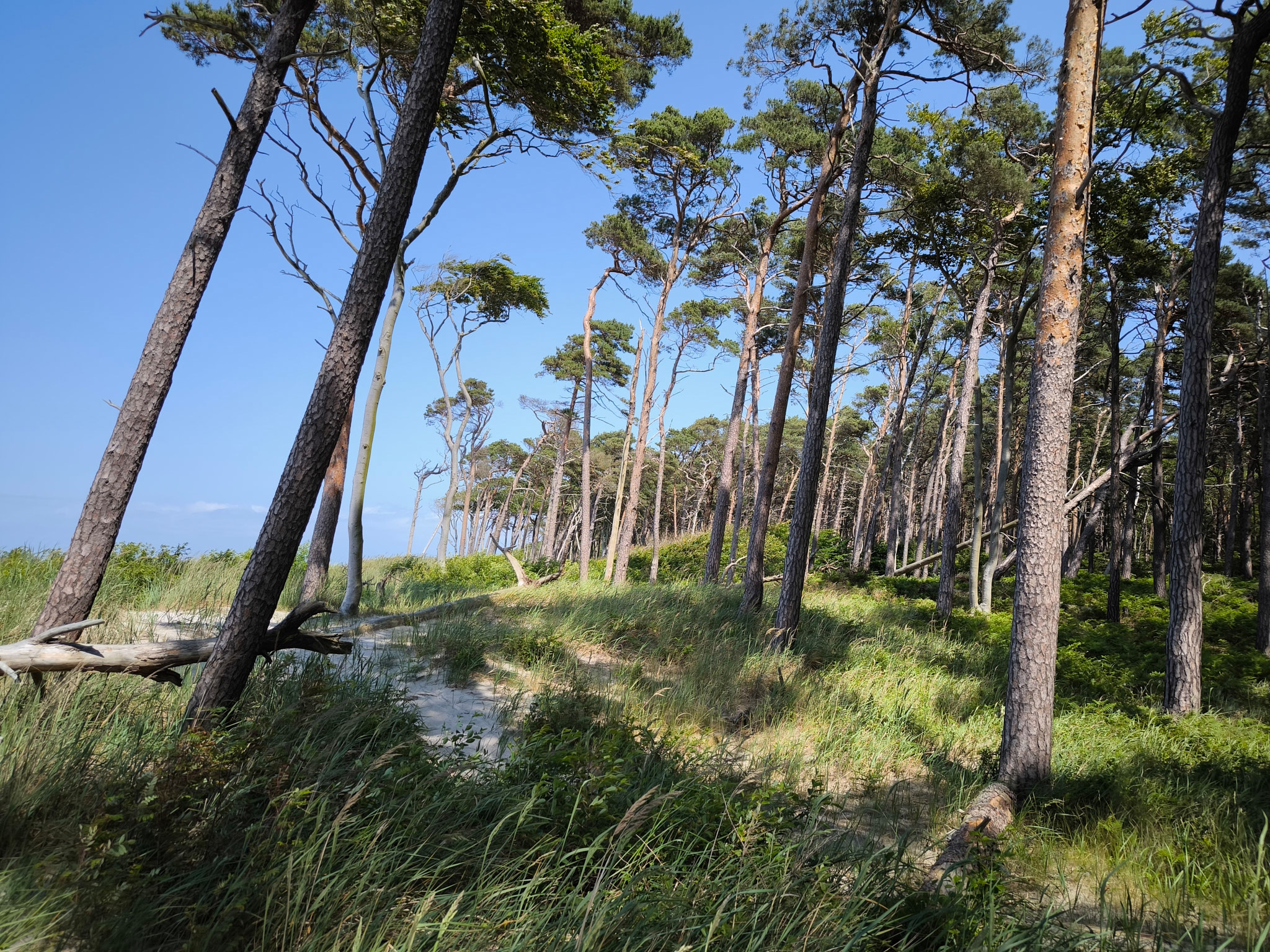 Auch der Wald gehört zur Düne! Im Nationalpark lassen sich jahrhunderte- oder mehrere tausend Jahre alte Dünen im Wald entdecken. Wer den Darsswald durchwandert, quert alte Dünentäler (Riegen) und Dünenrücken (Reffe). In den feuchten Riegen bilden sich Erlenbrüche und auf den Reffen wachsen Buchen und Kiefern.