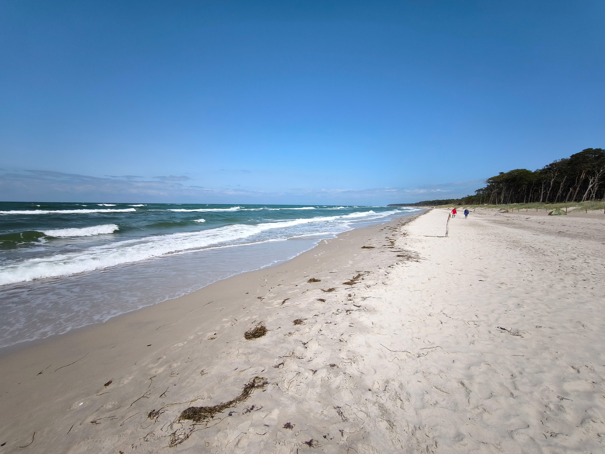 Nun muss ich mich etwas durch das wuselige Ahrenshoop kämpfen. Hier ist ganz schön viel los: Baustellen, Fussgänger, Fahrradfahrer und Autos teilen sich den knappen Platz. Nach dem Ortsausgang geht es aber mit recht gutem seitlichem Rückenwind auf dem geraden Deich Richtung Darsser Wald und Weststrand. Die Kette des Fahrrads scheint wie neu geölt, so einfach und schnell geht es vorwärts. Aber in meinem Hinterkopf meldet sich schon die Stimme, dass das auf dem Rückweg vielleicht etwas anstrengender werden könnte. Aber der Wind soll doch am späteren Nachmittag etwas abflachen…