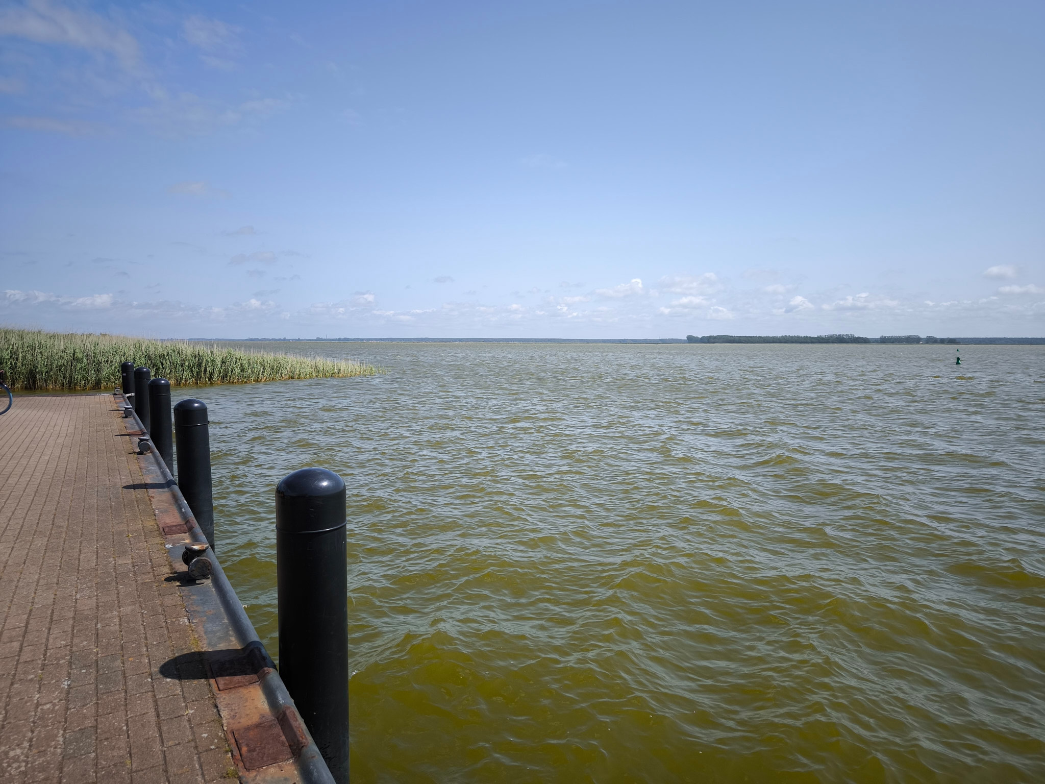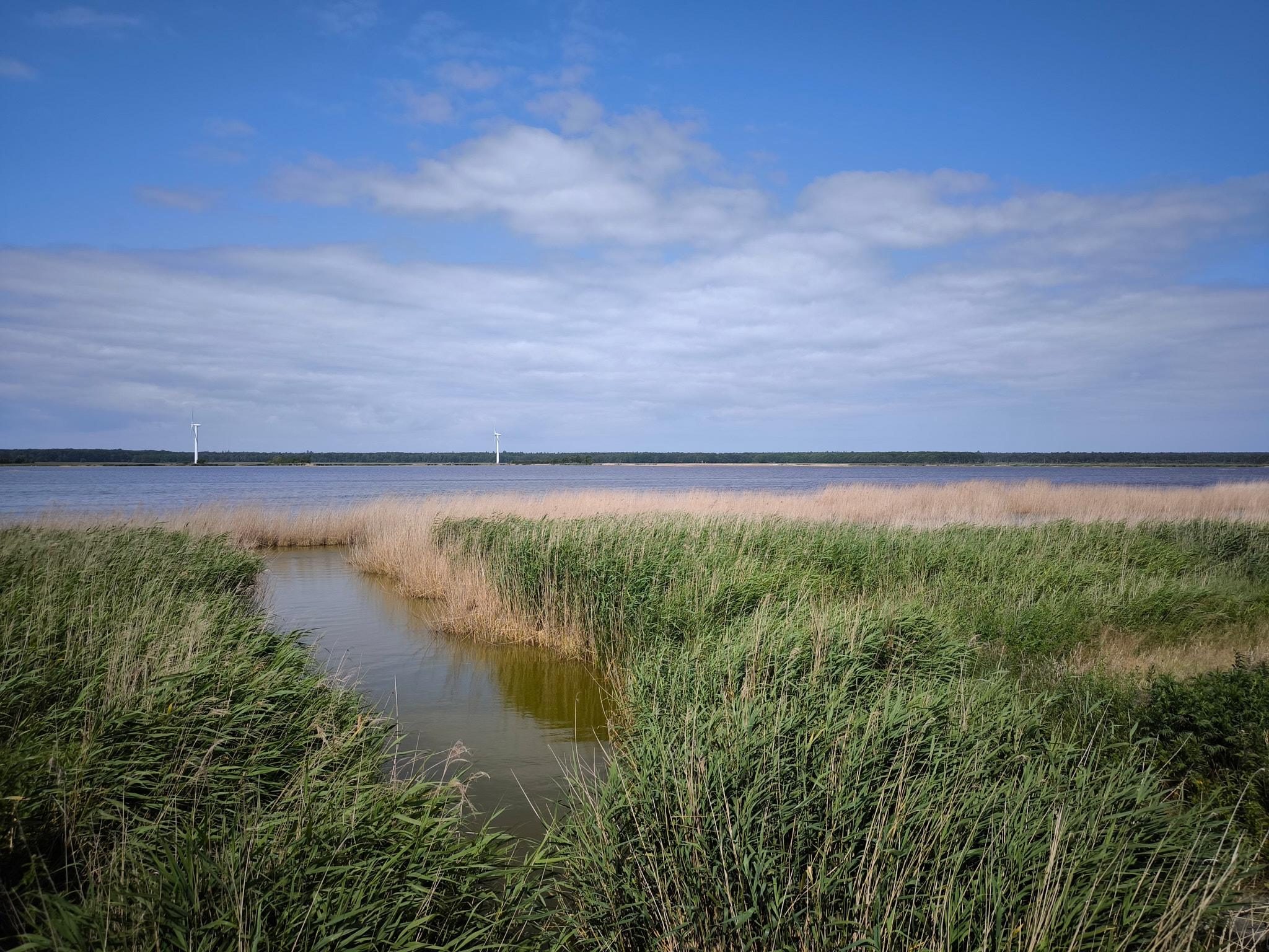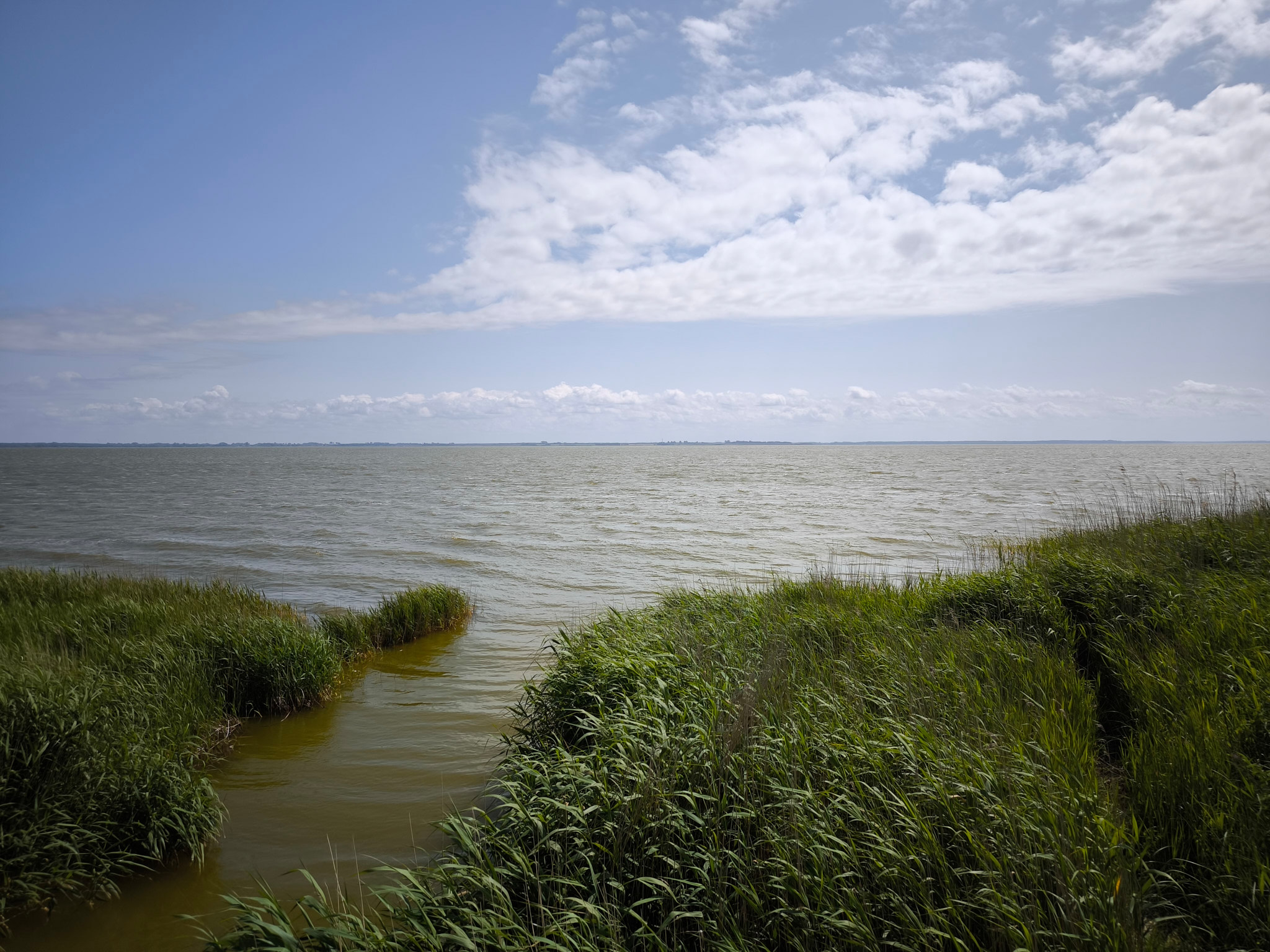 Nach dem Ort geht es auf einen Damm, der für rund 5km entlang des Polder Werren führt, welche früher als Grasland (unter dem Meeresspiegel) trockengelegt war, nun aber als Ausgleichsmassnahme renaturiert wurde. So fährt man gefühlt mitten durch den Bodden. Eine ganz ungewohnte Erfahrung: Rechts im Norden die weitläufige Brackwasserfläche des ehemaligen Polders Werren und links im Süden der Saaler Bodden.