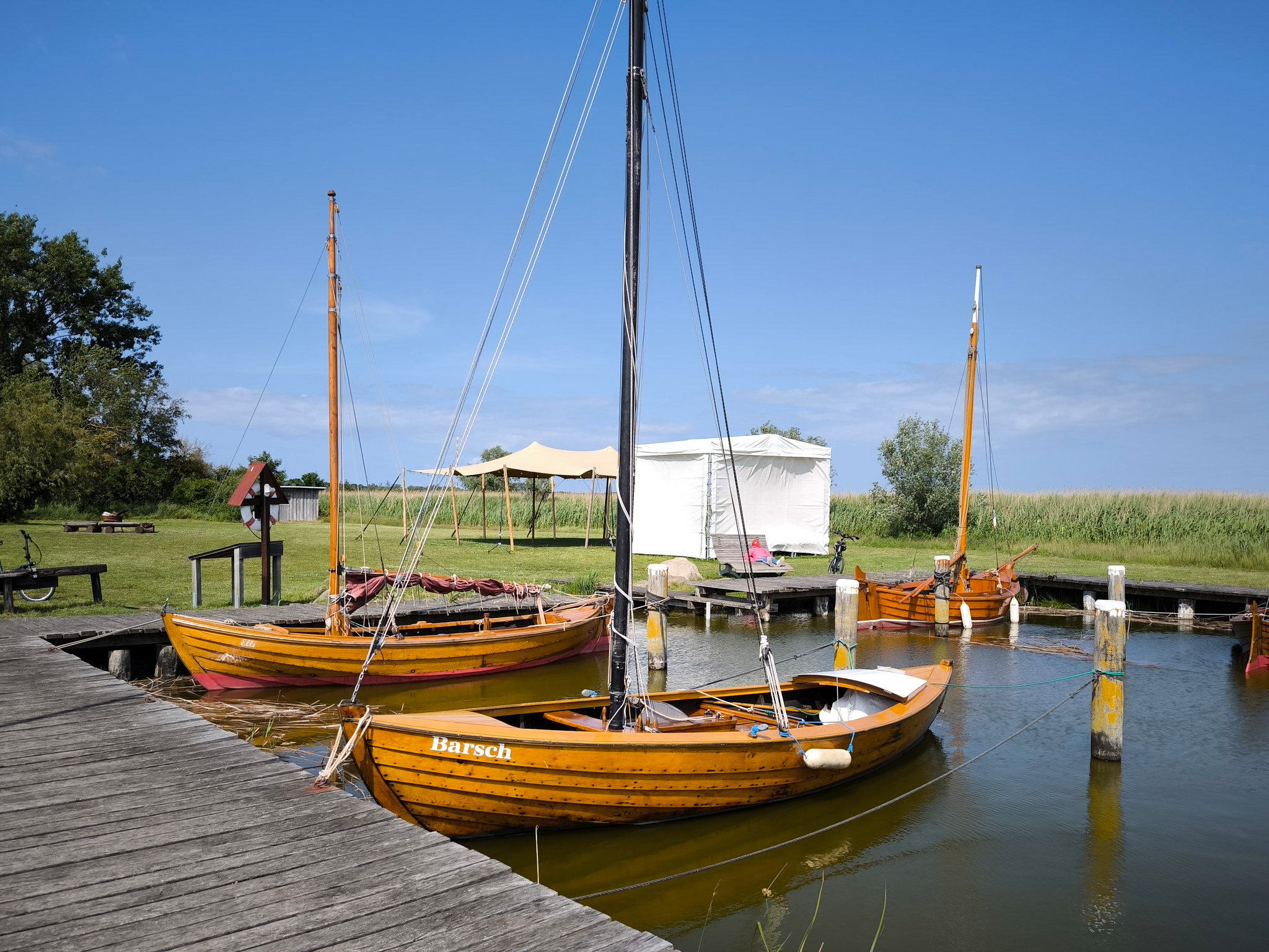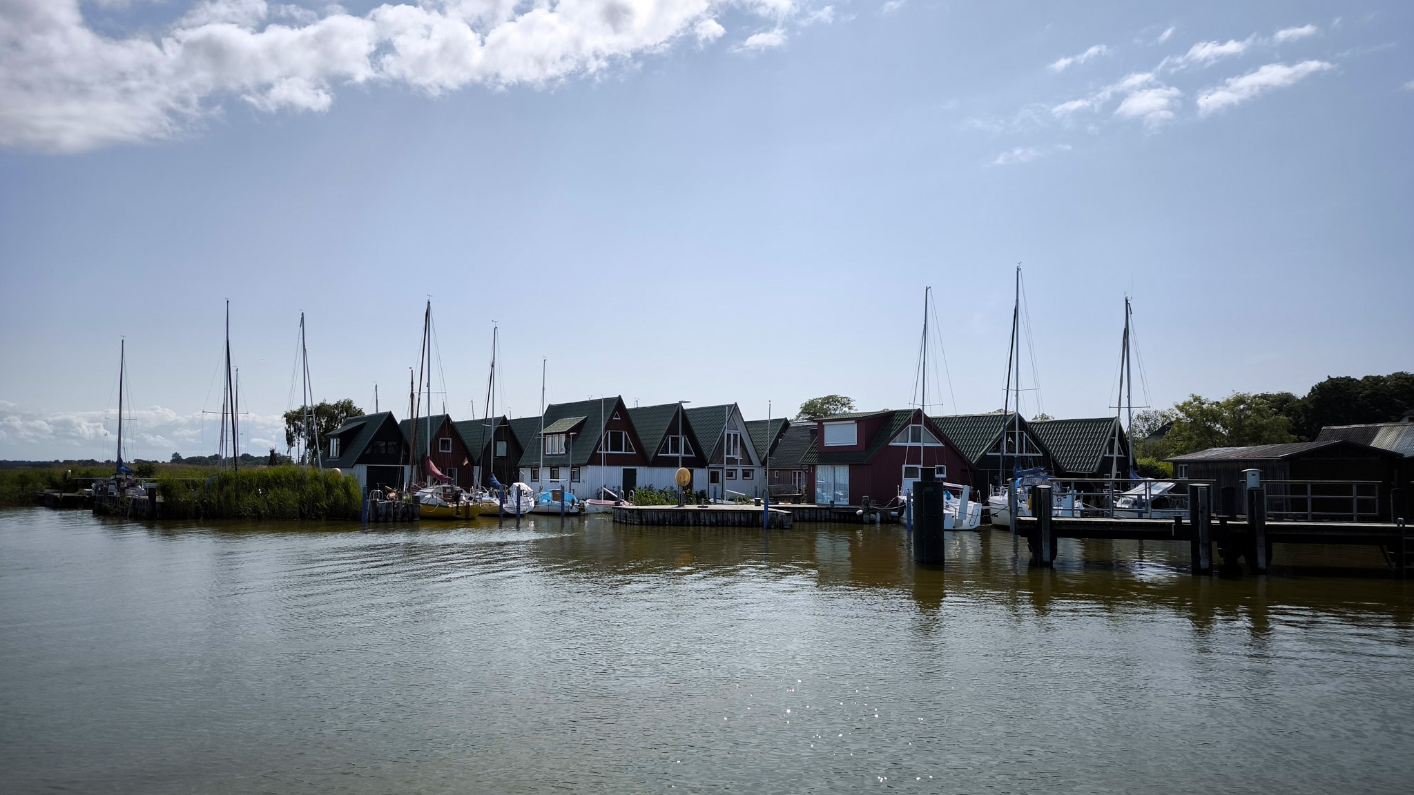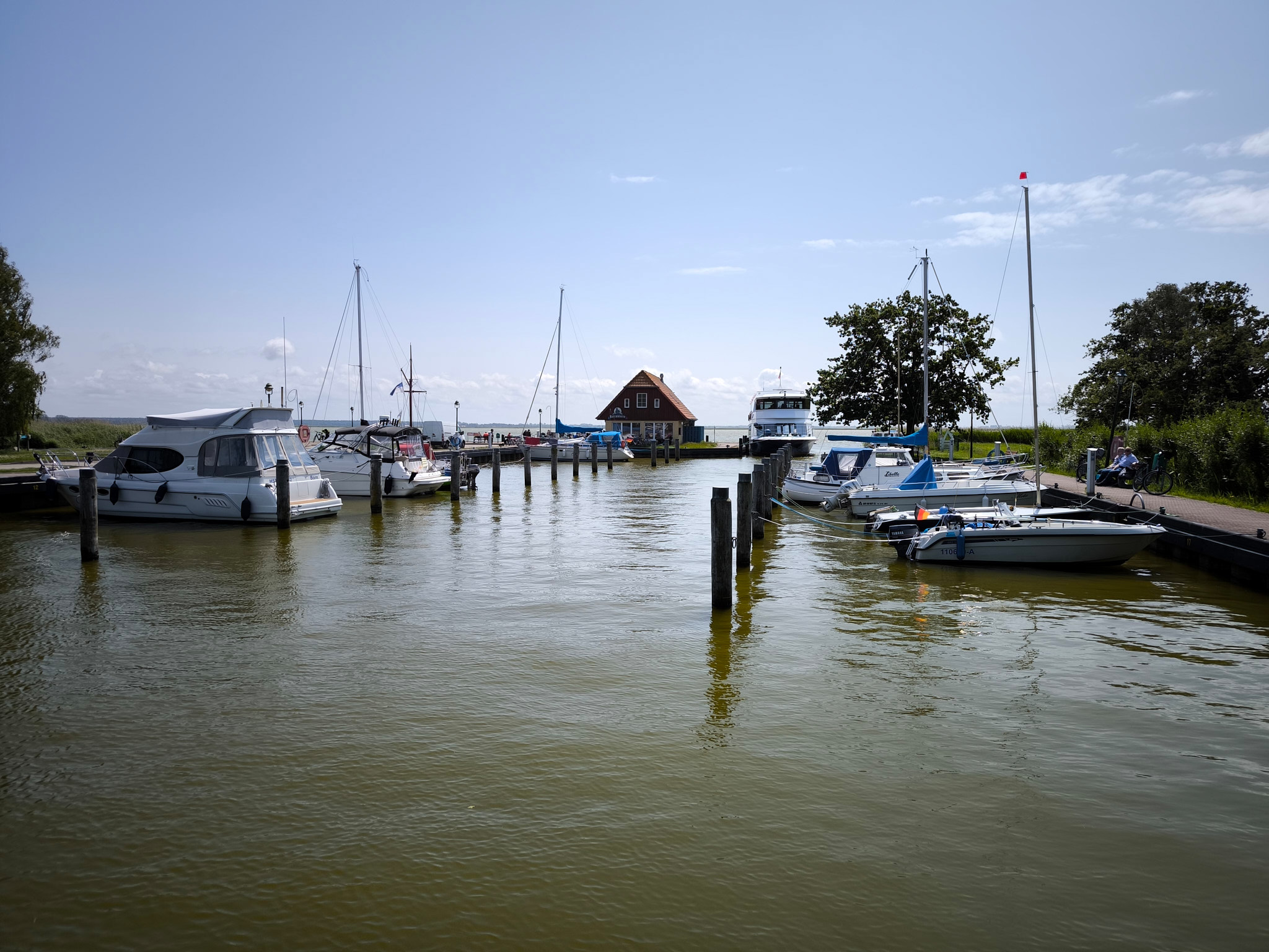 Im sehr lauschigen Born a. Darss angekommen, mache ich einen kurzen Zwischenstopp am Hafen, um mich an der Sonne etwas aufzuwärmen. Ich erinnere mich, dass schon 2016 mit dem Fahrrad die Boddendörfer Wieck und Born besucht habe (siehe mein Blogbeitrag von damals). Am Hafenkiosk ist ganz schön was los, aber ich finde eine freie Bank mit Aussicht auf das kleine Hafenbecken.