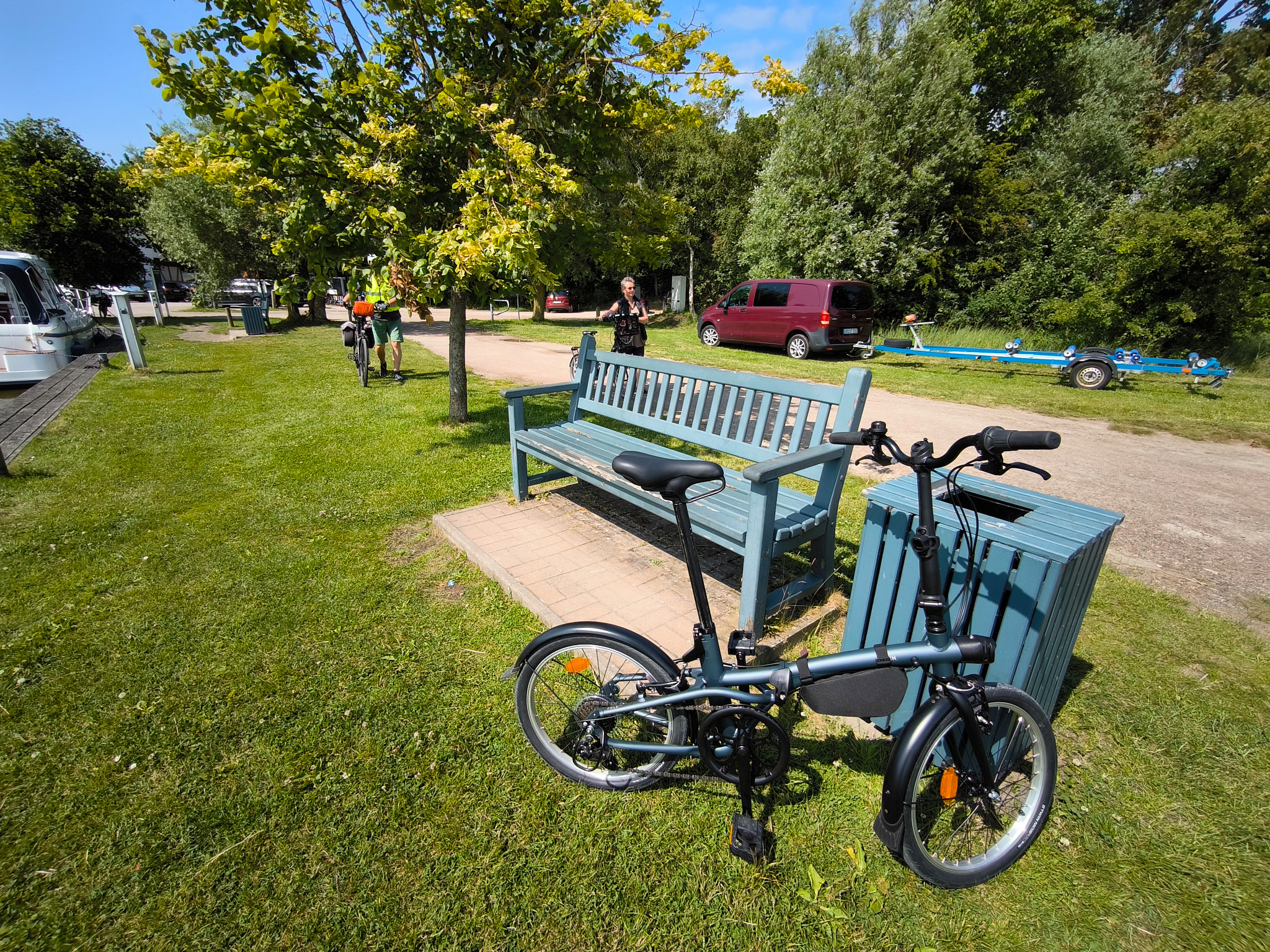 Heute war, nach der nächtlichen Regenzone, ab Mittag wieder sonniges Wetter mit stürmischem Westwind angesagt. Das ist dann wegen des Windes eher kein Strandtag. Daher habe ich mir überlegt, ob ich am Nachmittag rund um das Nachbardorf Ahrenshoop den vom Tourismusverband auf Komoot vorgeschlagenen, 12.7km langen Kunstpfad Ahrenshoop machen will. Dieser startet direkt an einem Parkplatz, aber die sehr hohen Parkplatzkosten (für 4h Parkdauer) schrecken mich ab. Es gibt nur einen versteckten, günstigen Parkplatz, wo das Tagesticket nur €3 kostet: Aber ich habe nur €2.50 in Münzen… Also entscheide ich mich, doch noch mein Faltvelo aus dem Kofferraum des Autos auszupacken und mit diesem die rund 3km ins Nachbardorf zu fahren, um die Wanderung dort zu starten.